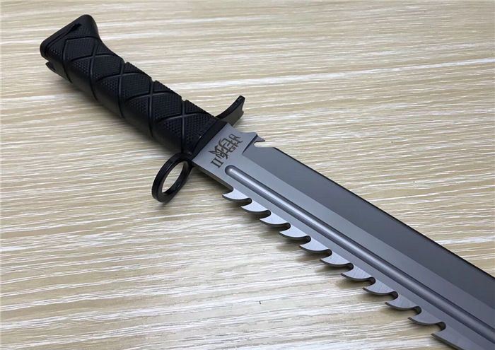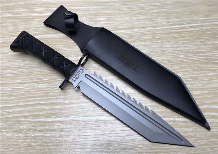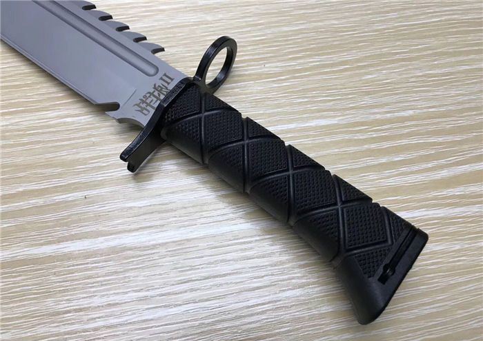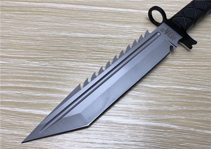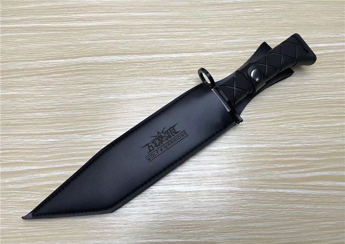 平头战狼军用刀皮套 全 长:36.7CM 刃 长:24.0CM 柄 长:12.6CM 身 最大宽度:4.5CM 刀 厚:0.55CM 刃 面:喷砂 毛 重:700克 钢 材:5CR13钢 硬 度:57 刀 柄:绝缘强化塑胶 刀 鞘:仿真刀套+彩盒