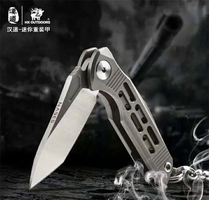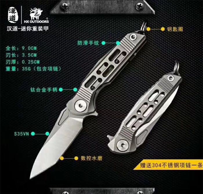 粗犷野性、精致炫酷;汉道迷你重裝甲折刀,整刀刀刃与刀柄比例协调,外观粗犷野性;刀刃采用S35VN耐磨钢,硬度高,耐磨损,抗腐蚀性强,防锈能力优秀,硬度韧性有保障;刀刃数控水磨,开刃大胆犀利;钛合金手柄,质量轻巧,硬度适中;手柄前后端设计防滑手纹,中段枪管风格镂空设计,握感舒适稳固,造型精致酷炫;整刀内置KVT滚珠轴部系统,配合快开鳍,快开迅速流畅,操作简单;配备专用防水收纳盒,更显高档珍贵