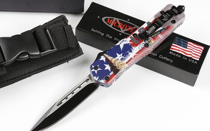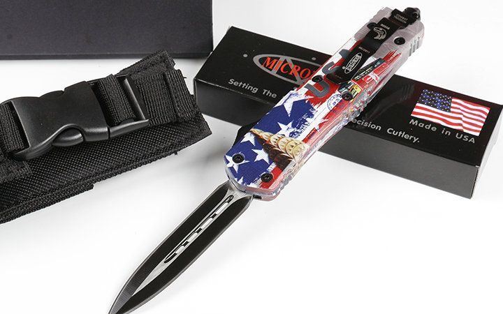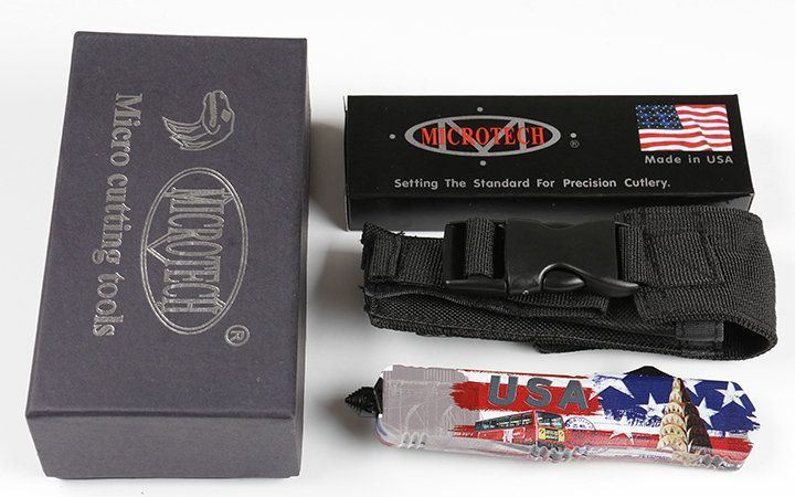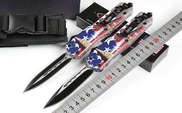微技术伤齿龙A07直出跳刀T1(两款美国国旗) 全 长: 23.0cm (含尾锥长度) 刃 长: 9.0cm 刃 厚: 3mm 刃 材: 440 硬 度: 57HRC 刀净重:230.0克 总重量:350.0克(含包装物) 表 面: 黑钛伴拉丝 柄 材: 锌铝合金+披覆 刀 鞘: 尼龙 锁 闭: 弹簧直出 备 注:带背夹和玻璃撞针