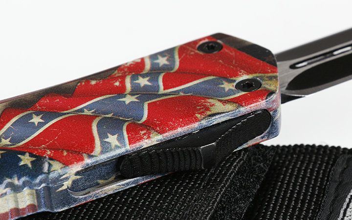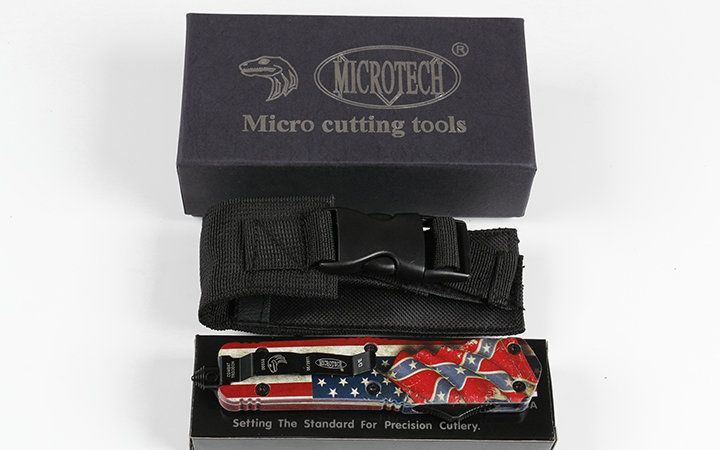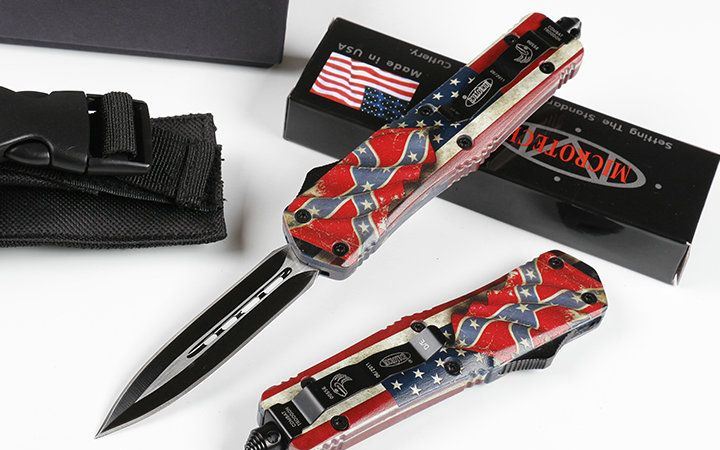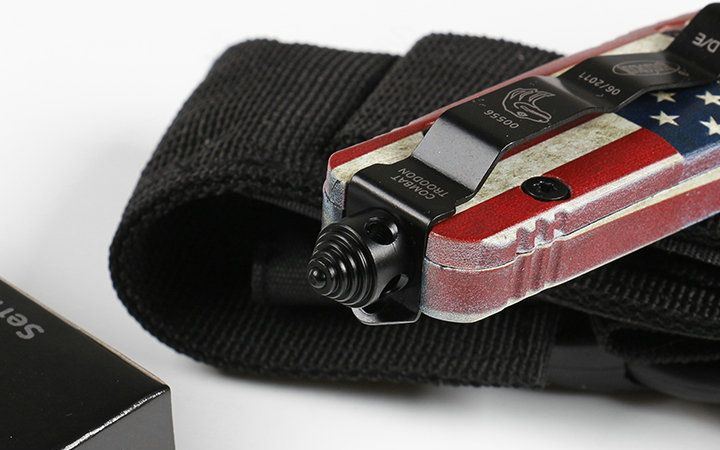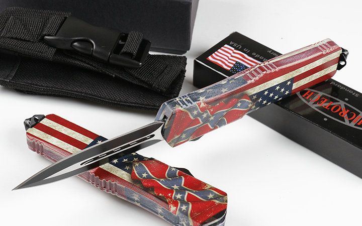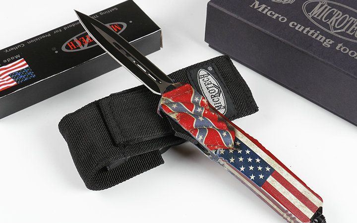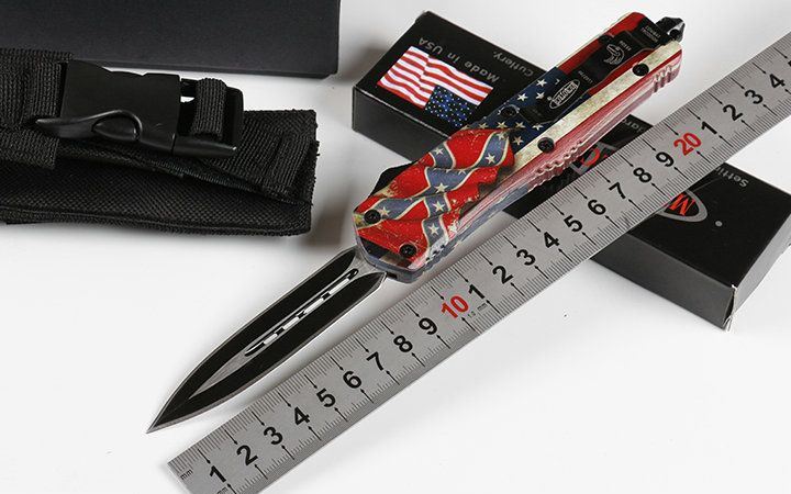 微技术伤齿龙A07直出T2双刃跳刀 全 长: 23.0cm (含尾锥长度) 刃 长: 9.0cm 刃 厚: 3mm 刃 材: 440 硬 度: 57HRC 刀净重:230.0克 总重量:350.0克(含包装物) 表 面: 黑钛伴拉丝 柄 材: 锌铝合金+披覆 刀 鞘: 尼龙 锁 闭: 弹簧直出 备 注: 带背夹和玻璃撞针