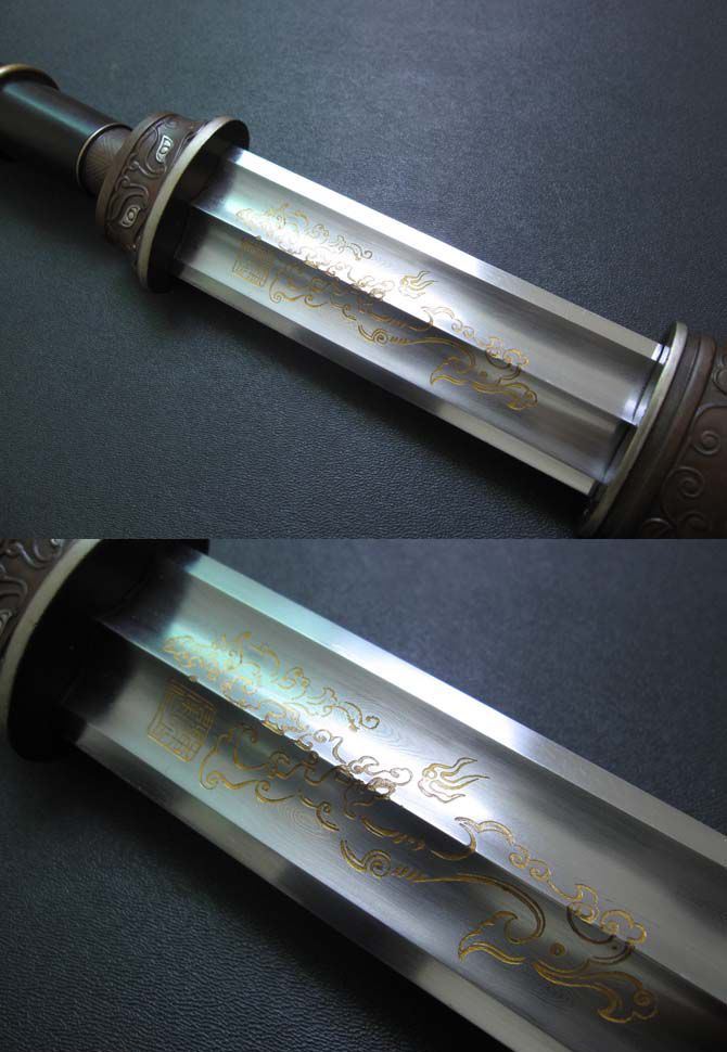 【工艺】加工工艺:精选多种优质钢和铁矿砂混合,精炼而成地基钢,采用传统手工锻造的工艺,反复锻打出自然花纹,决不是用药水出来的花纹,古人谓之百炼钢。经过淬火、回火等传统热处理工艺,十三道手工古法研磨,刃纹流畅,可以削纸断竹。