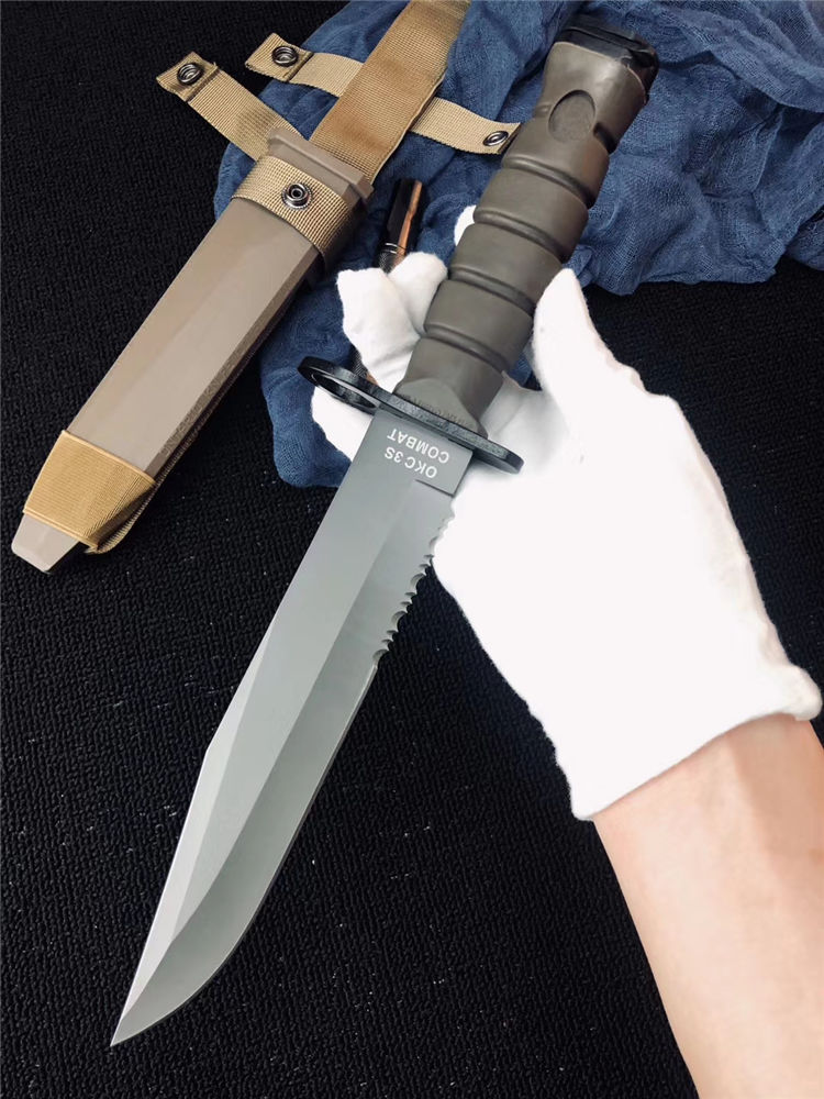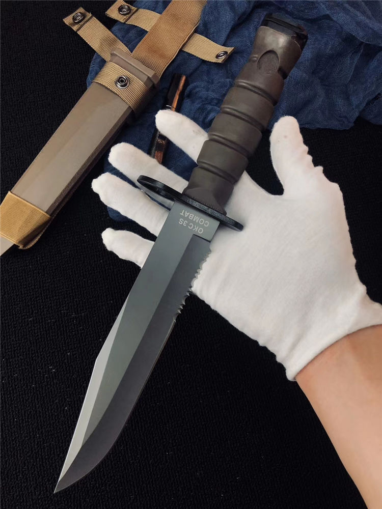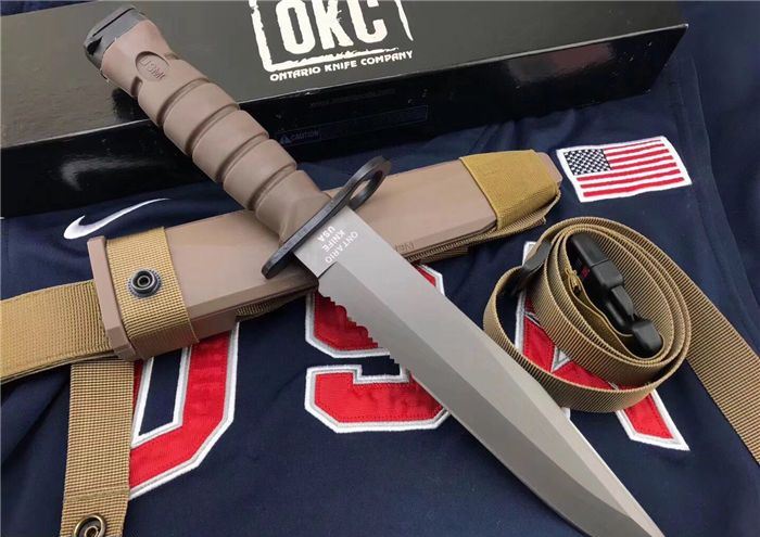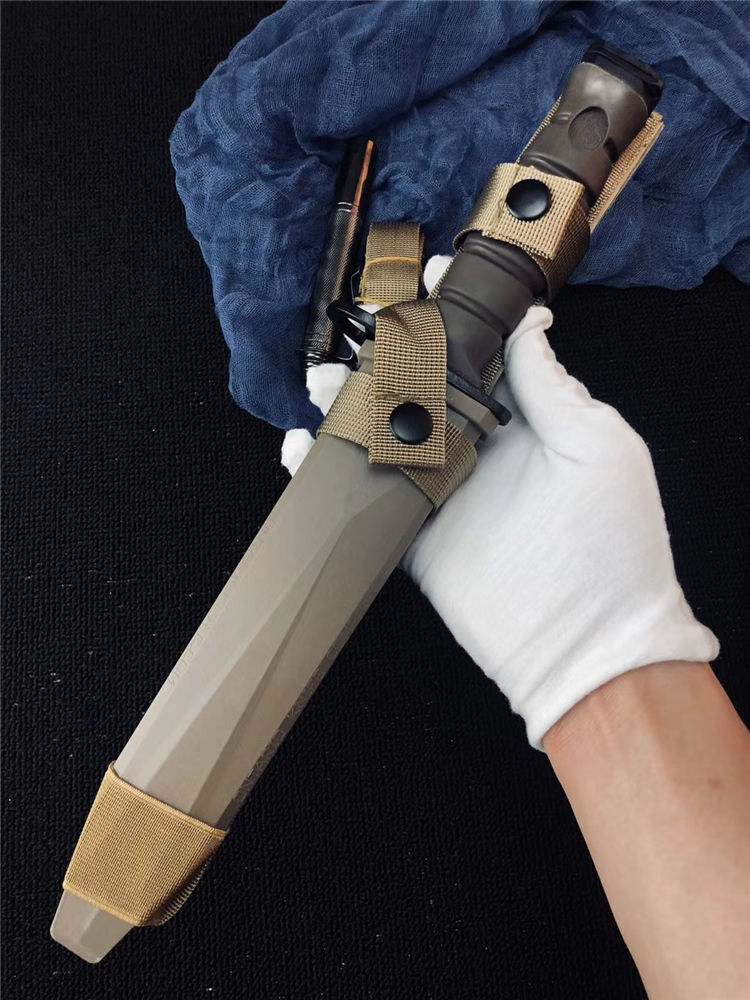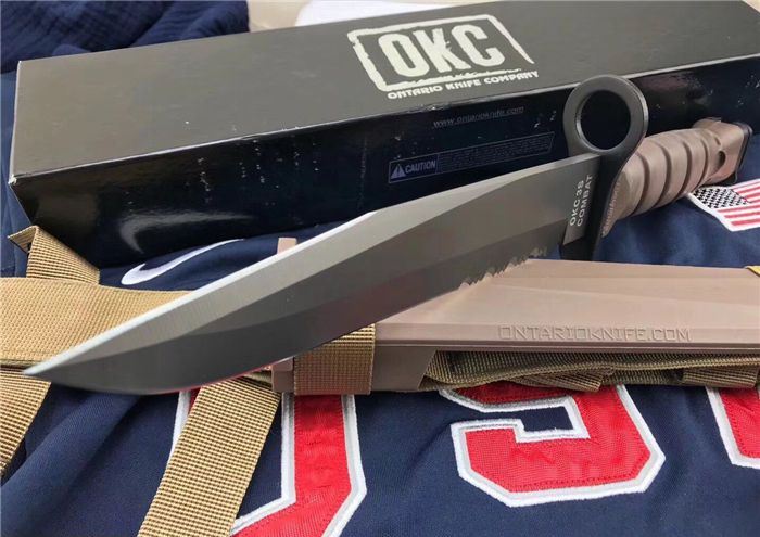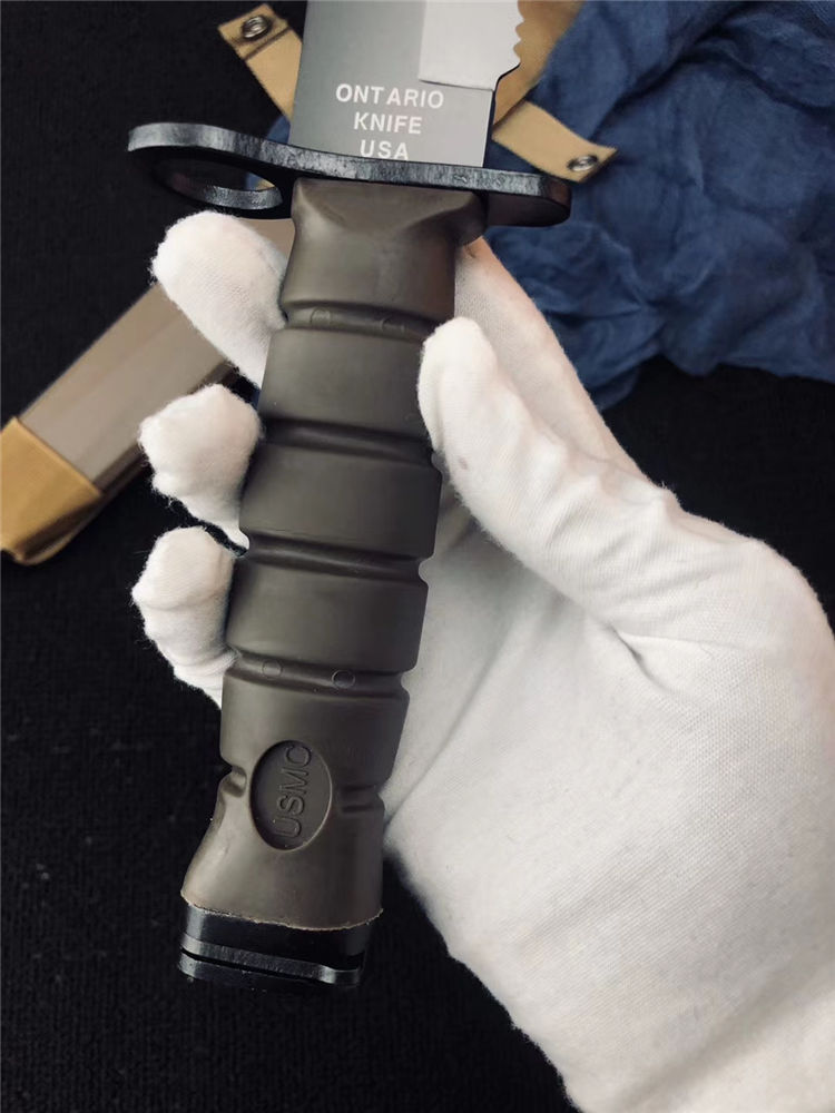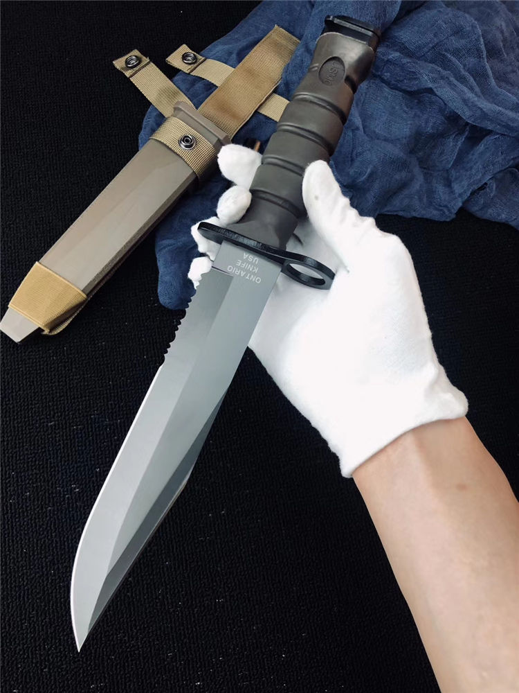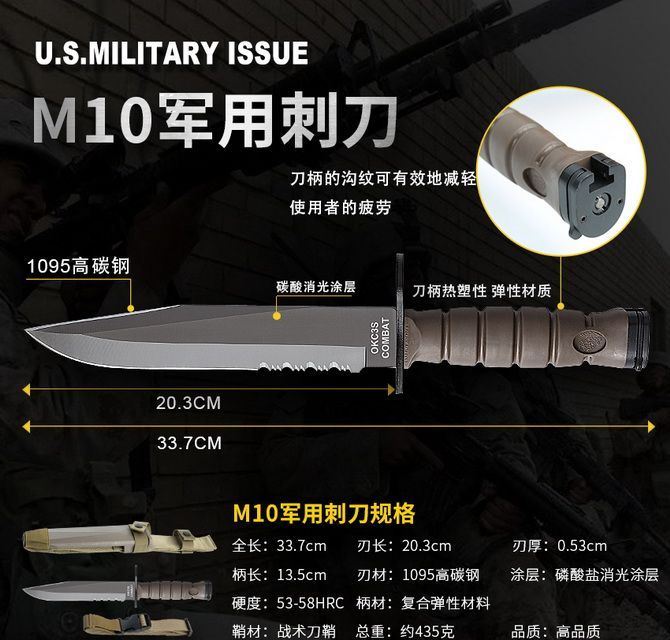 高防美军安大略M10军刺 刃材:1095高碳钢 柄材:复合弹性材料 涂层:磷酸盐消光涂层 全长:约33.7厘米 刃长:约20.3厘米 刃厚:约5.3厘米 硬度:53-58HRC 重量:约435克 刀鞘:战术刀鞘