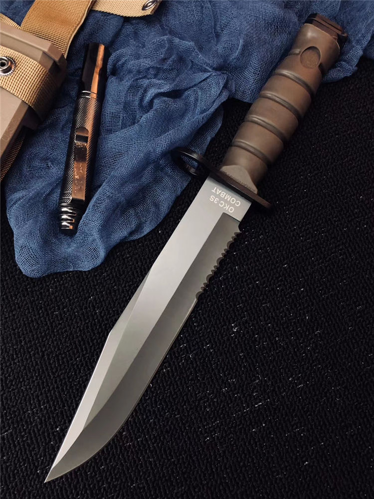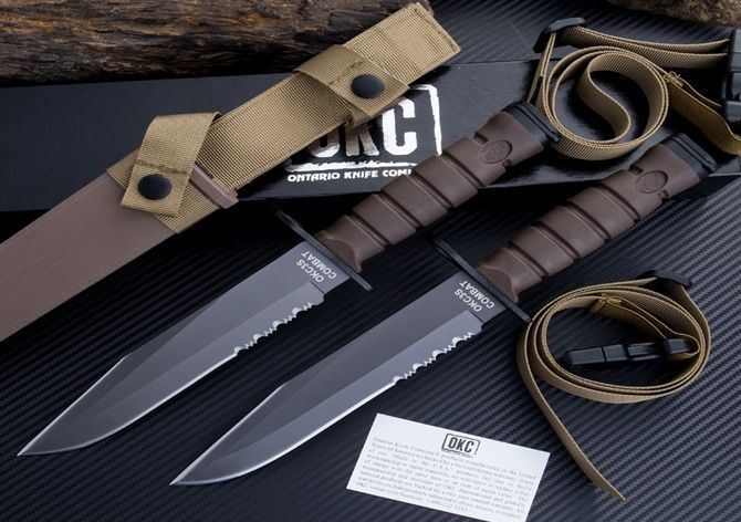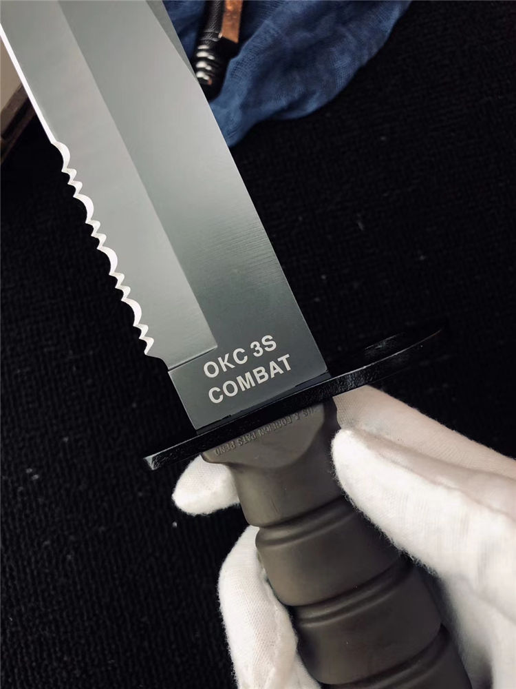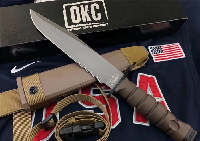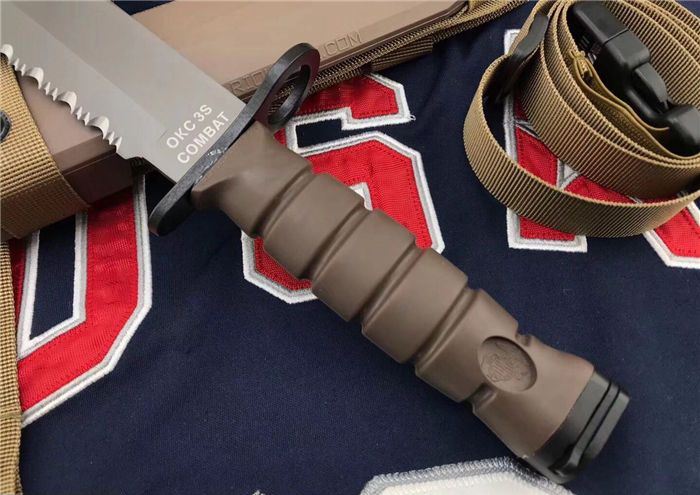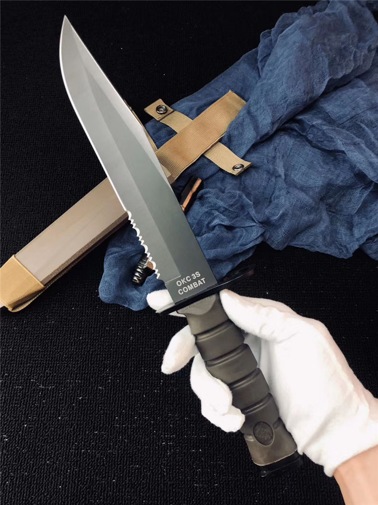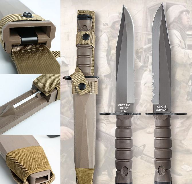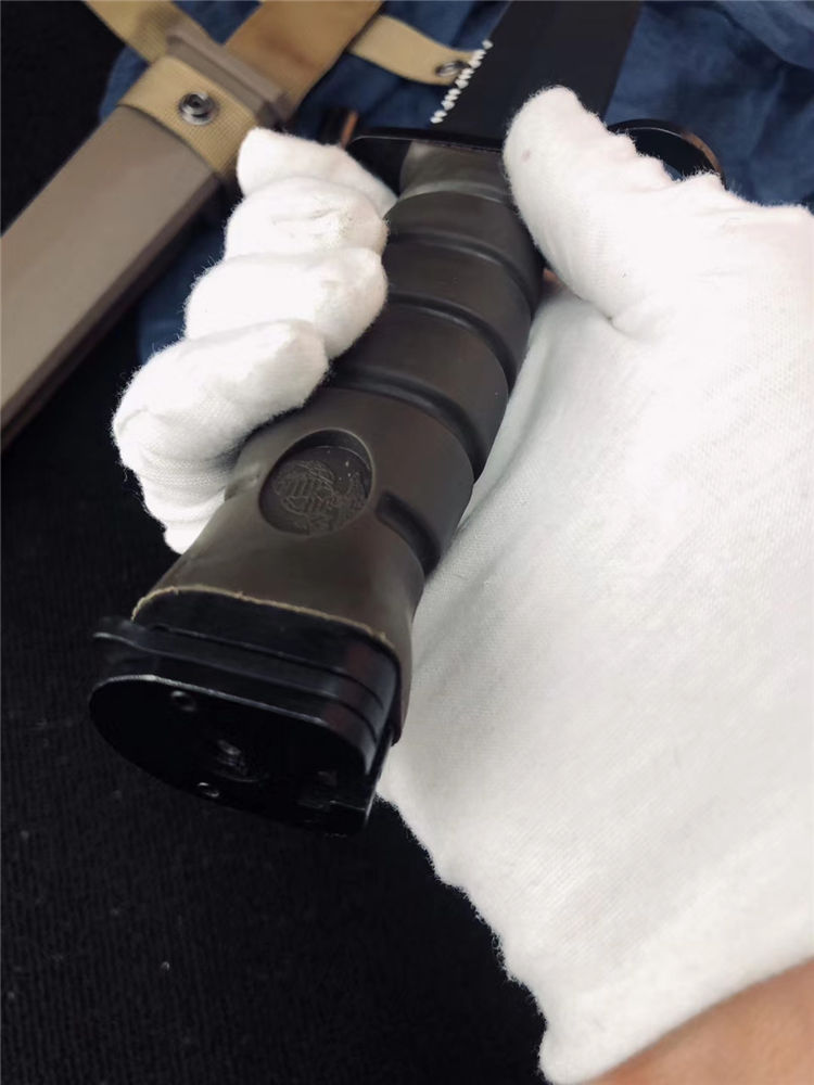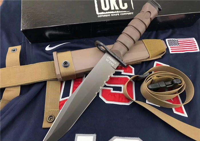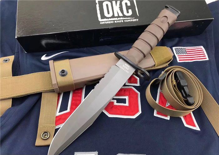高防美军安大略M10军刺 刃材:1095高碳钢 柄材:复合弹性材料 涂层:磷酸盐消光涂层 全长:约33.7厘米 刃长:约20.3厘米 刃厚:约5.3厘米 硬度:53-58HRC 重量:约435克 刀鞘:战术刀鞘