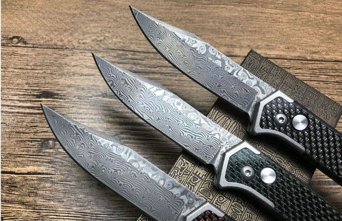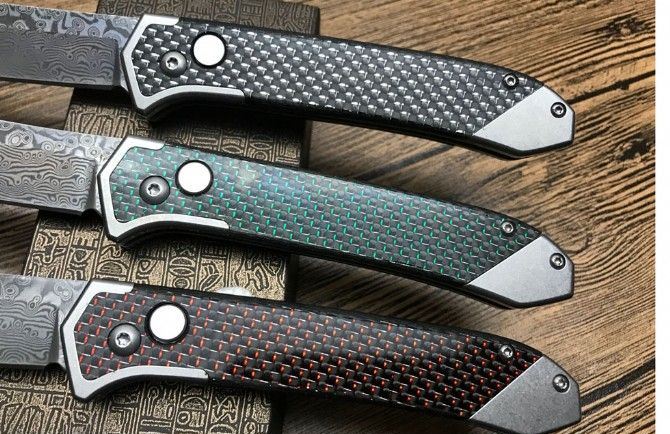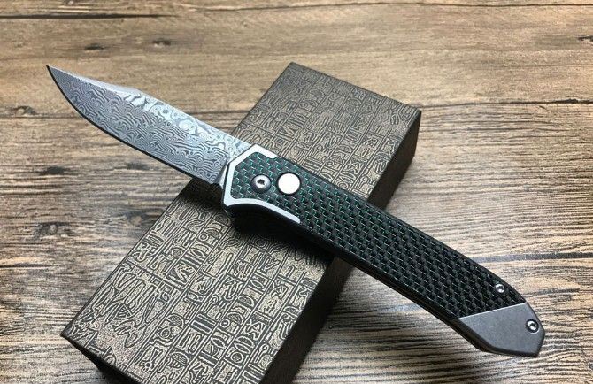 托马斯大马士革荧光碳纤柄跳刀 全长:20.2mm 刃长:8.4mm 柄长:11.5mm 刃宽:2.1mm 刃厚:0.30mm 刃材:大马士革钢 重量:196g(含包装) 硬度:58—60HRC 表面:大马士原纹 柄材:钢头+双面荧光碳纤 锁型:杠杆纽扣锁定,弹簧快速打开刀刃 其他:礼品盒刃口锋利