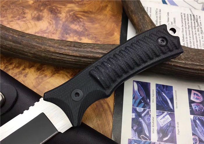 古巴小猎刀 全 长:240mm 刃 长:105mm 柄 长:130mm 刃 宽:31mm 刃 厚:5mm 刃 材:8CR18Mov 重 量:420克(含包装) 硬 度:59HRC 表 面:发黑+拉丝 柄 材:G10 锁 型:定锁 其 他:配真皮套
