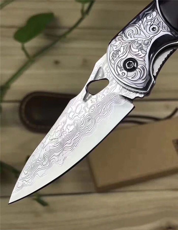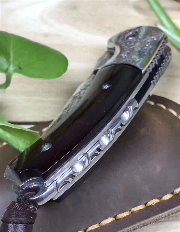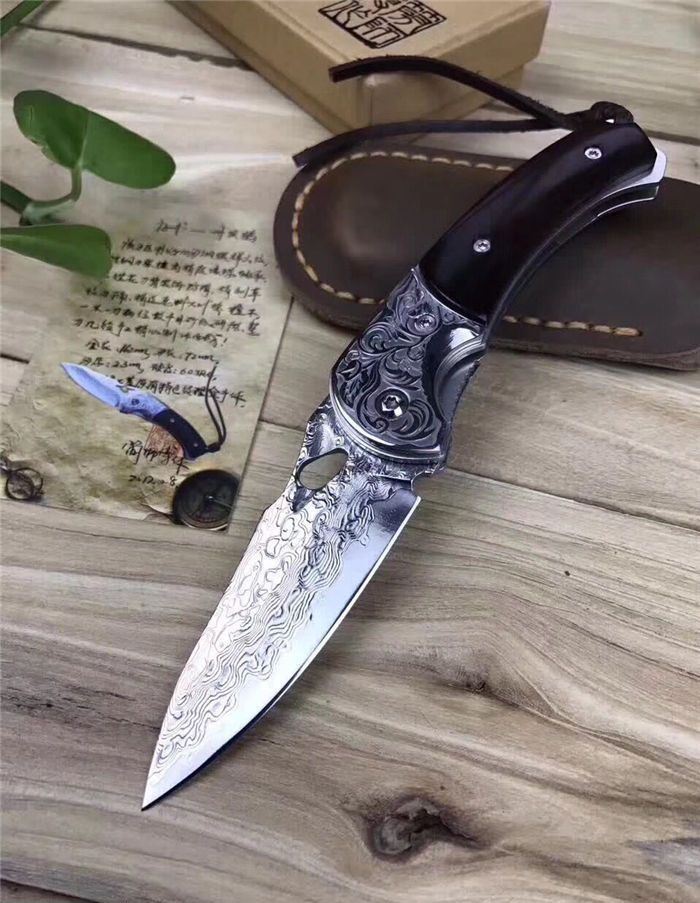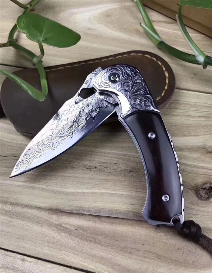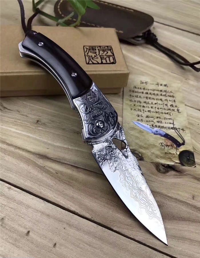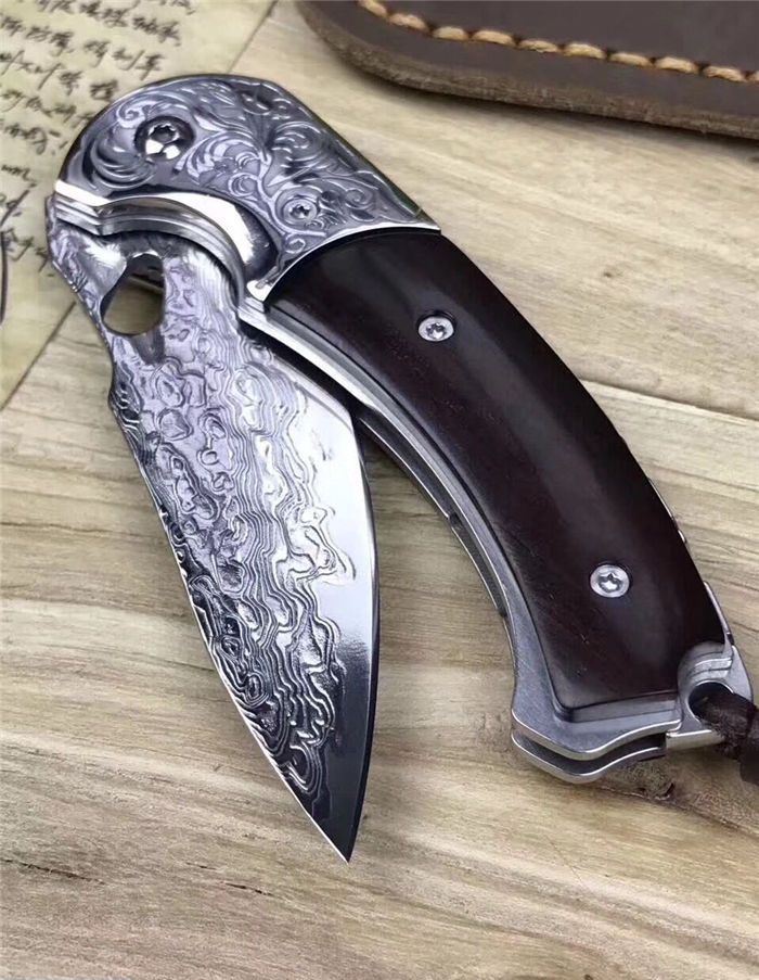 简师傅丹顶鹤大马士革折刀 全长:16.2cm 刃长:7.2cm 刃厚:2.3mm 硬度:60HRC 刃材:VG10刃钢大马士革 刀柄:镶嵌老料大叶紫檀木柄 配头层复古牛皮手工皮套,赠送简师傅亲笔证书