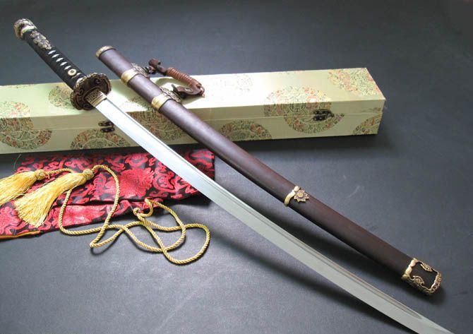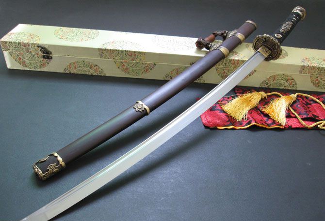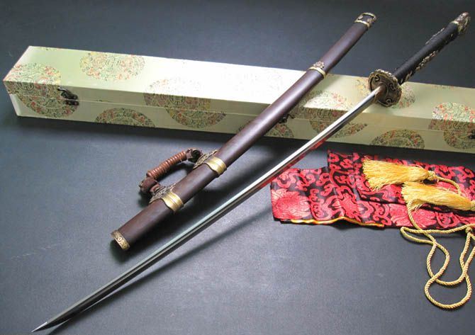 工艺:加工工艺:精选多种优质钢和铁矿砂混合,精炼而成地基钢,采用传统手工锻造的工艺,反复锻打出自然花纹,决不是用药水出来的花纹,古人谓之百炼钢。经过淬火、回火等传统热处理工艺,十三道手工古法研磨,刃纹流畅,可以削纸断竹。剑鞘采用名贵酸枝木制作,越摸越古色古香;剑装为黄铜制作。
