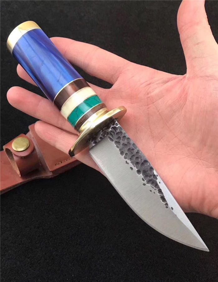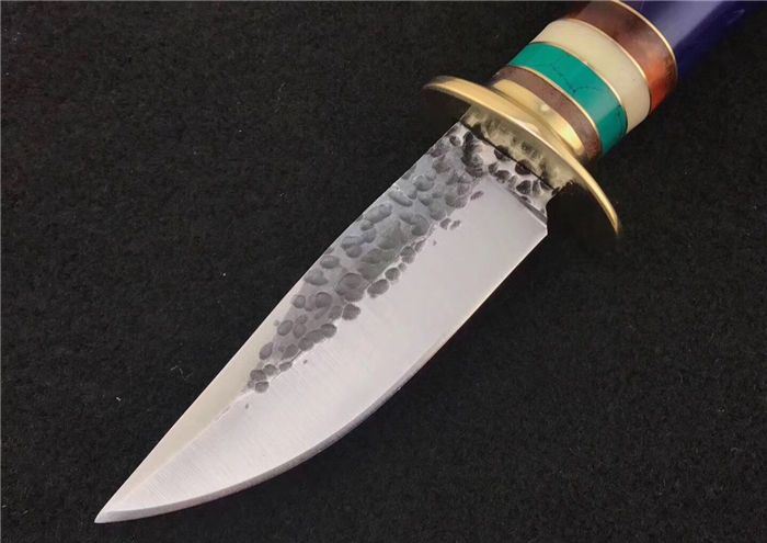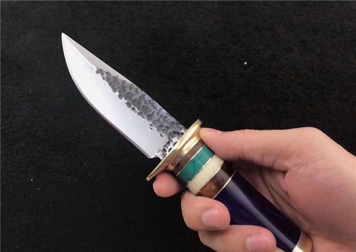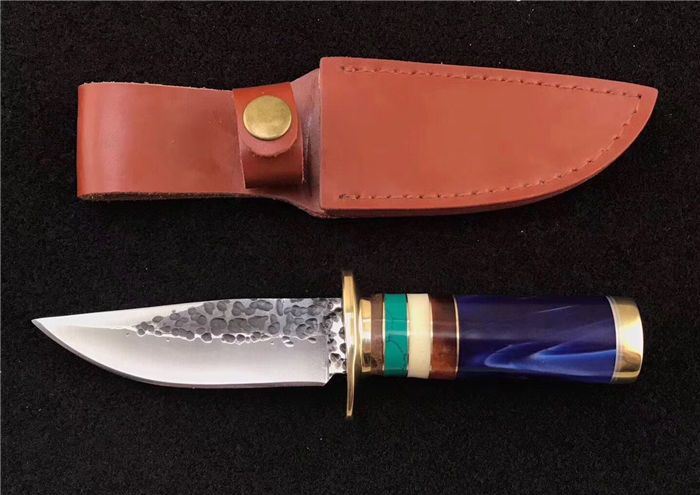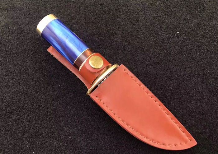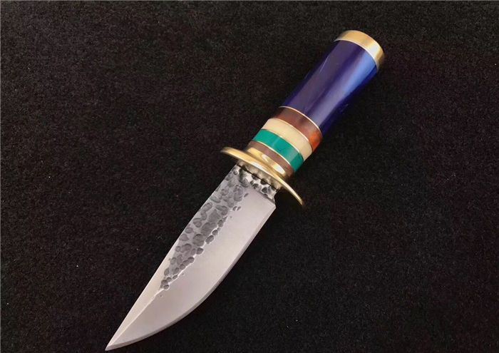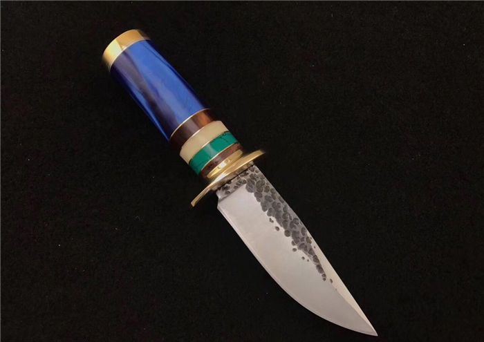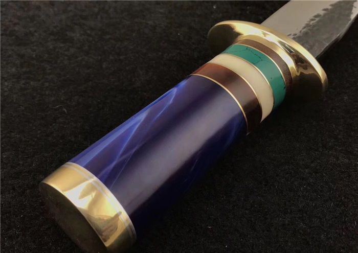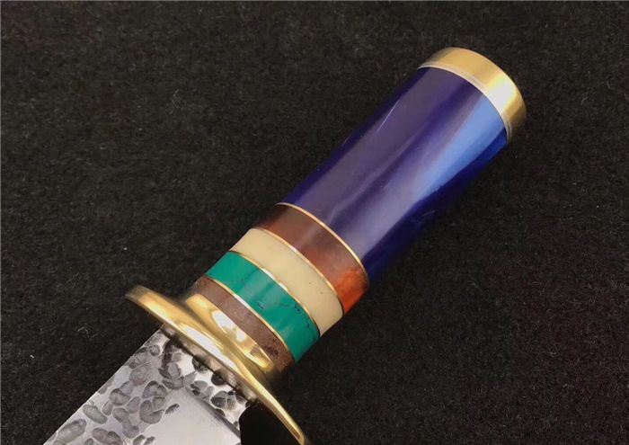 锻打蓝宝石直刀 全长: 190mm 刃长: 100mm 柄长: 900mm 刃宽: 30mm 厚度: 4mm 重量: 260kg 钢材: 钝手工锻打 柄材: 铜头十彩石 刀套: 皮套