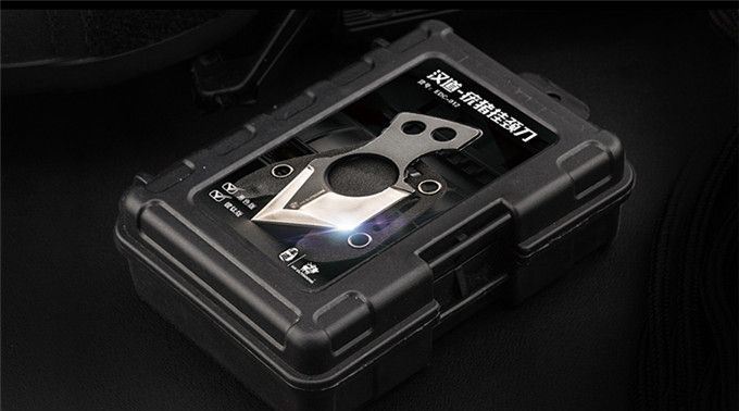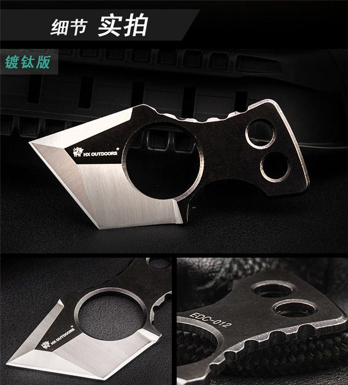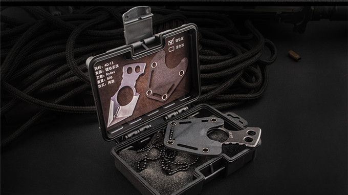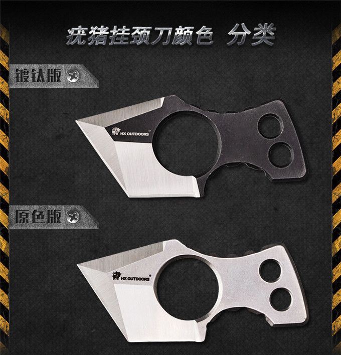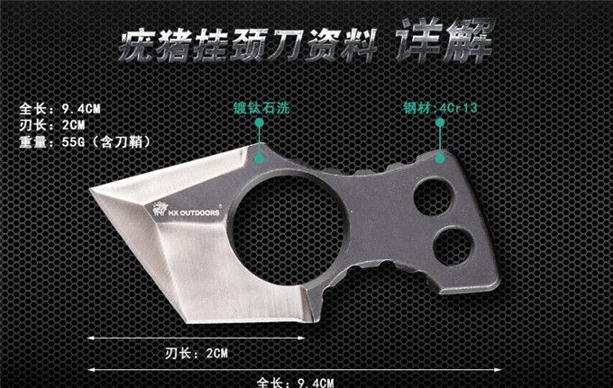 汉道疣猪挂颈刀 全长:9.4CM 刃长:2CM 刃材:4Cr13 重量:55G(含刀鞘) 表面处理:镀钛石洗 刀鞘:K鞘