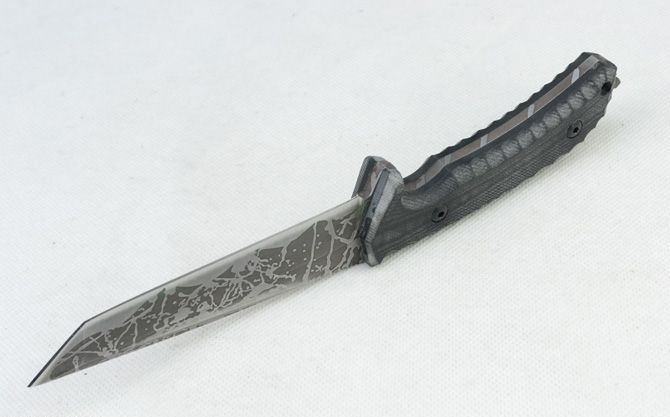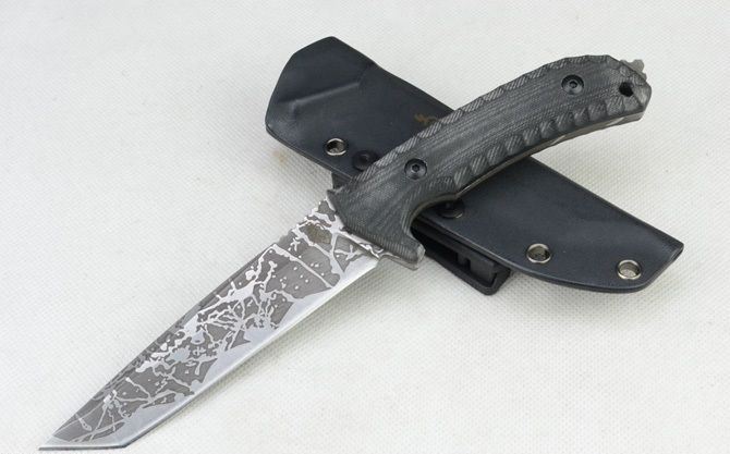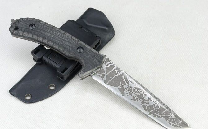 松田菊男武士版直刀 全长:25.3cm 刃长:12.8cm 刃厚:0.42cm 刃宽:3.1cm 刃面:酸洗纹 刃材:8CR14MOV 柄材:G10 柄长:12.5cm 硬度:59HRC 总重:399克(含战术K鞘、盒子) 刀套:战术K鞘