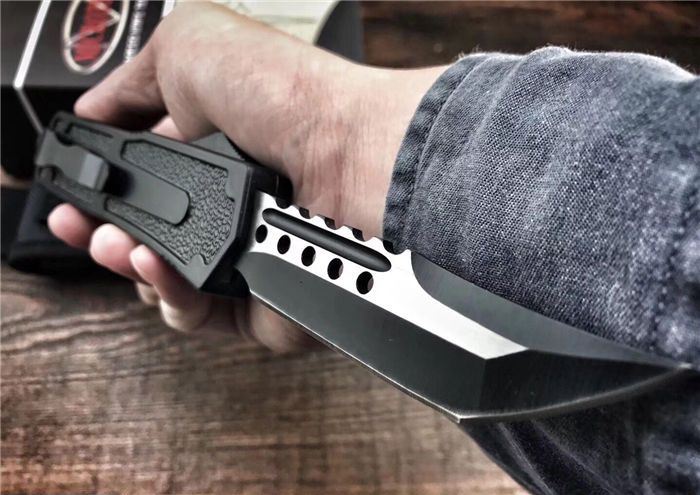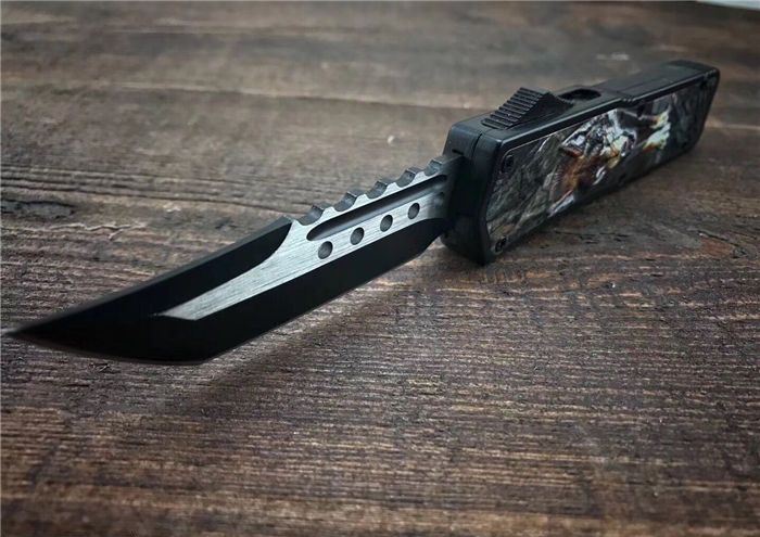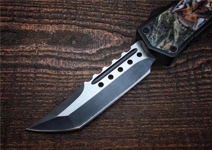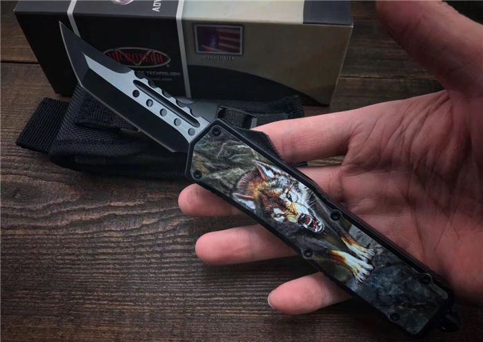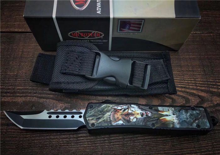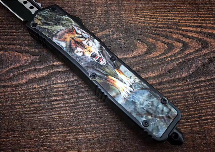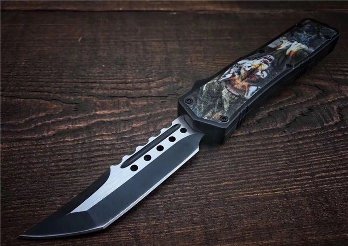 图腾地狱之狼跳刀平头 全长:23CM 刃长:9CM 柄长:14CM 刃厚:0.3CM 硬度:56 HRC 刃材:440 表面:发黑拉丝 把手:扎花加热影印技术图案,耐刮 净重:220克(整刀) 毛重:330克(含包装物) 开合:双动作,直推开关,自动弹出和收回 包装:耐磨专用战术尼龙套 口袋刀夹:弹簧刀夹 玻璃敲击器:不锈钢玻璃敲击器
