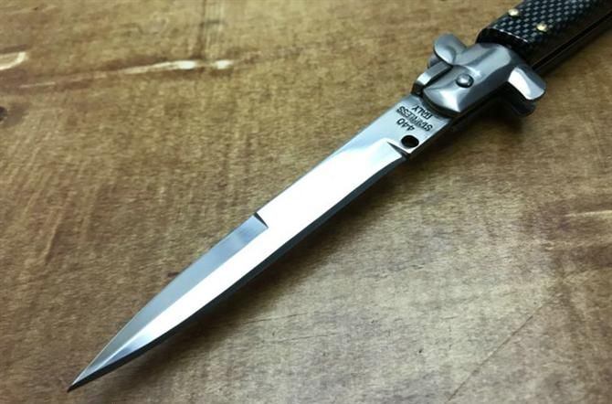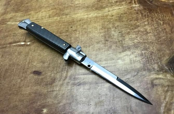 意大利黑手党经典侧跳刀(仿纤维柄) 全长:22.0cm 刃长:8.0cm 柄长:12.5cm 刃宽:1.2cm(最宽处) 刃厚:3.0mm 刃材:440 硬度:55HRC 刀柄:树脂纤维柄片 表面:镜光 开刀方式:自动横出 重量:120.0克