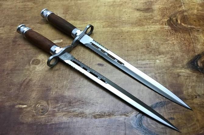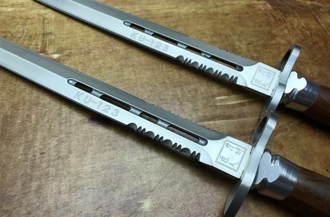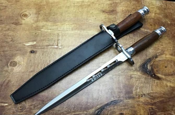 KU123双刃格斗军刺 全长:38.2cm 刃长:26cm 刃厚:0.45cm 刃宽:4cm 刃材:5铬13高级不锈钢 柄材:双铝头加钢护手 硬度:58HRC 刀重:400克(含刀鞘) 包装:仿皮套