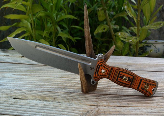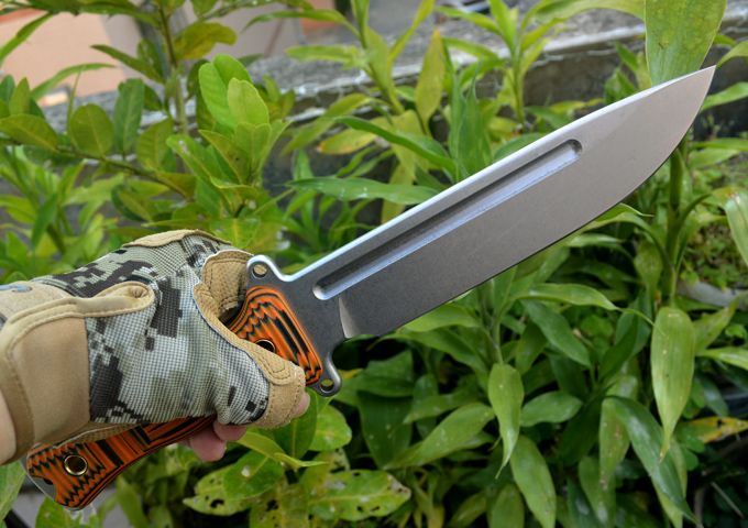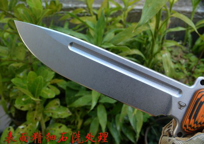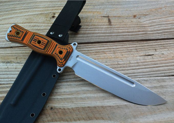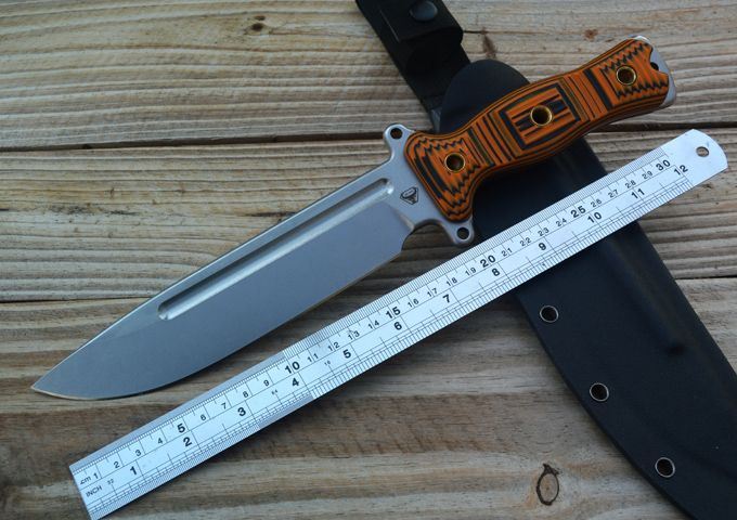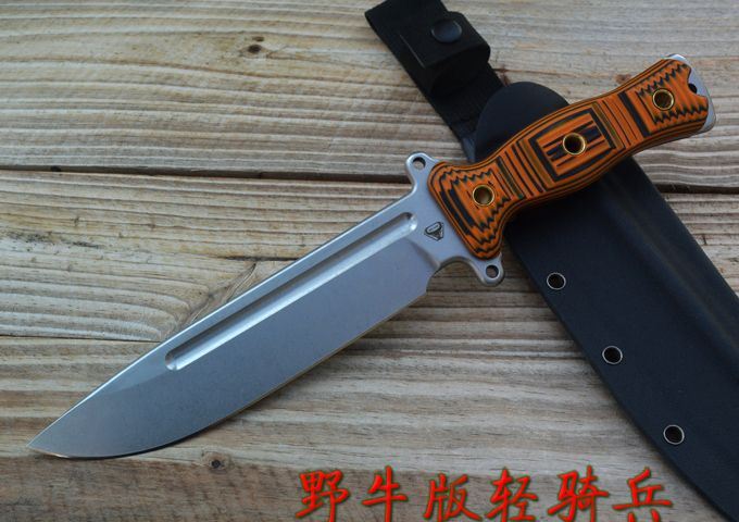野牛轻骑兵战术直刀 全长:333mm 柄长:138mm 刃长:195mm 刃厚:6.0mm 刃宽:42mm(最宽处) 刃材:DC53 重量:500g(刀净重,不含鞘) 硬度:59-60HRC 柄材:橙黑夹层G10 刀鞘:美国进口Kydex 磨式:数控V磨 表面处理:精细石洗 热处理:真空油淬(增加晶体颗粒细腻度,具有最好的韧性) 包装:黑色礼品盒