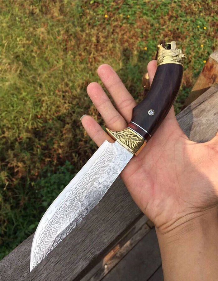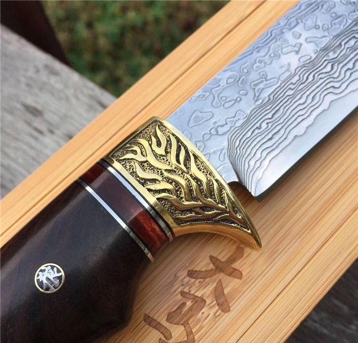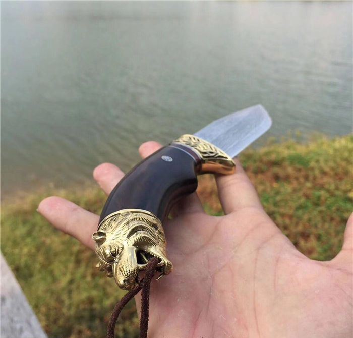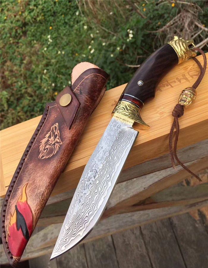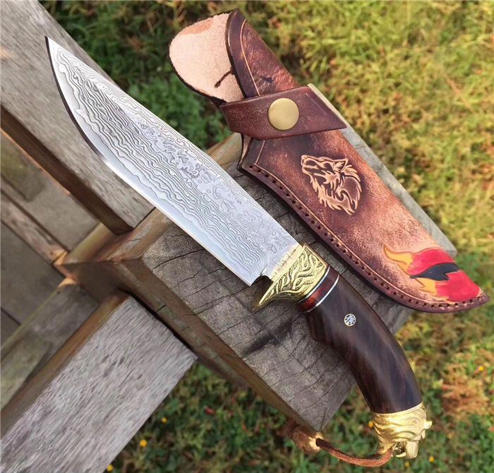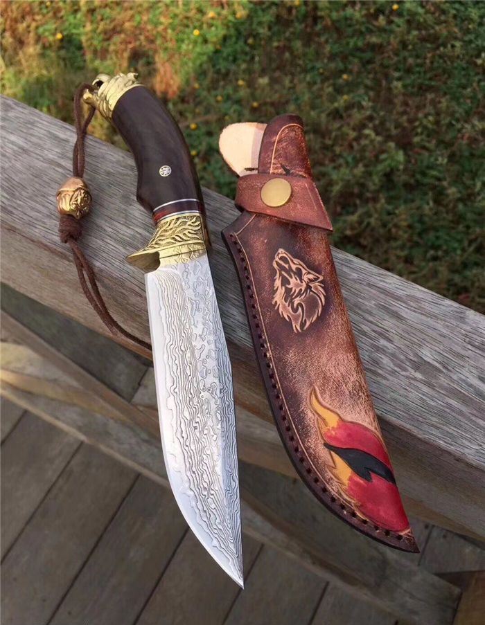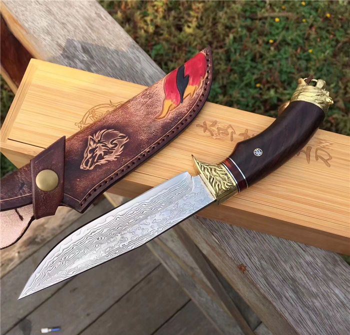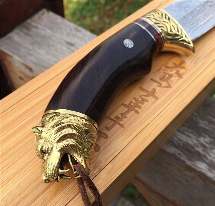 战狼1代中型大马士革博弈刀 全长:28cm 刃长:15cm 手柄:13cm 刃厚度:4.2mm 刃钢材:大马士革钢 硬度:60HRC 手柄材料:纯黄铜雕刻护手+黑檀木+狼头 皮套:手工制作鞣植狼头牛皮套 包装:高端竹盒+羊皮抹刀布+(美国大兵吊坠)