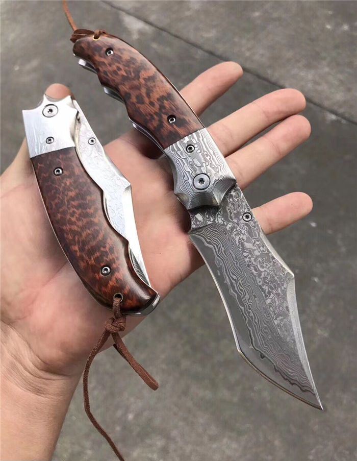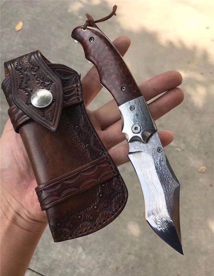 TUREN猎豹二代大马士革折刀 总长:21cm 刃长:8.5cm 刃厚:4mm 刃宽:约3.2cm 钢材:日本夹层大马士革钢(钢芯层VG10钢) 硬度:58-60HRC,真空热处理 皮套:阿根廷进口植鞣皮纯收工缝线雕花,复古效果 包装:硬盒子包装 开刃方式:水冷二次开刃,锋利度好,一把实用性户外收藏高端折刀