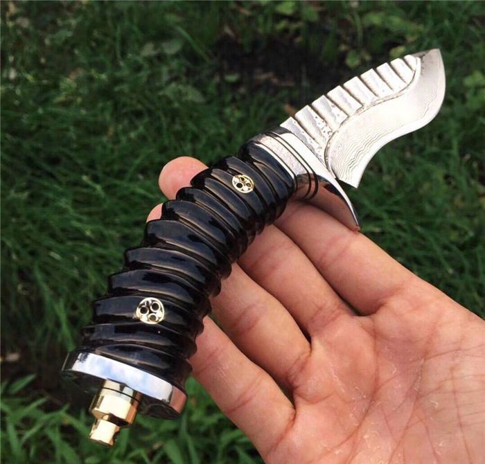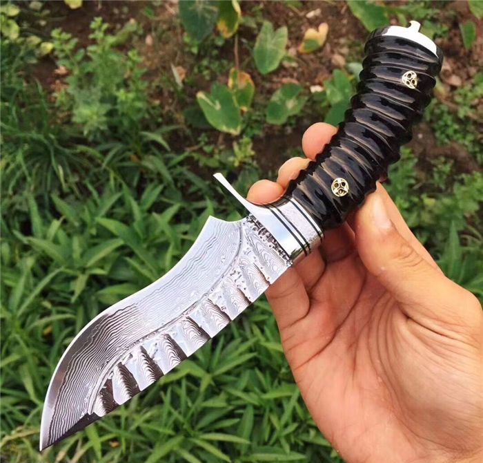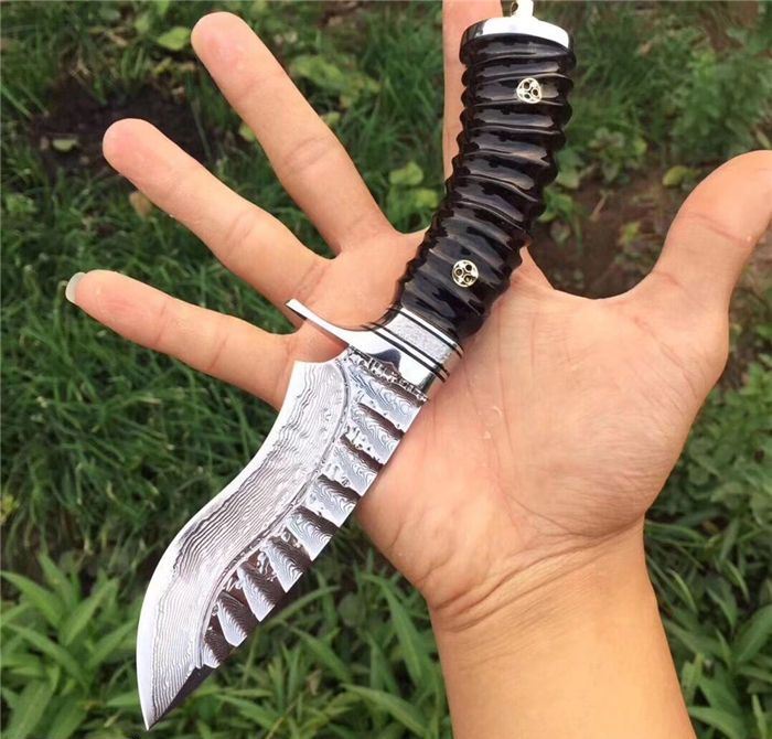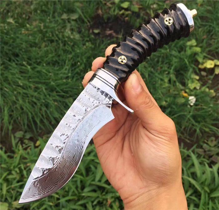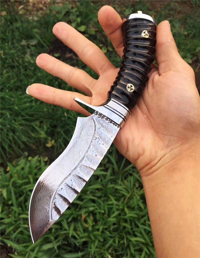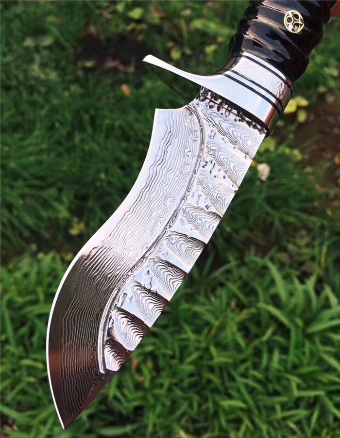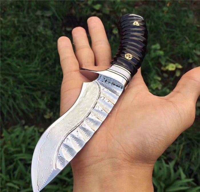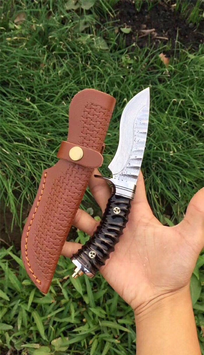 继任者大马士革高端手工猎刀 全长:22cm 刃长:11cm 柄长:11cm 刃厚度:4MM 刃材:进口大马士革钢 硬度:60HRC 手柄材料:天然无暇黑羊角 配置:头层手工皮套+礼盒包装