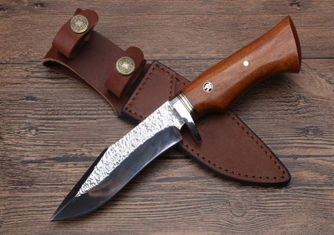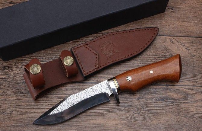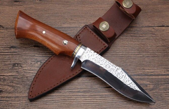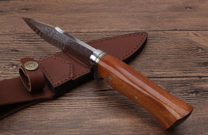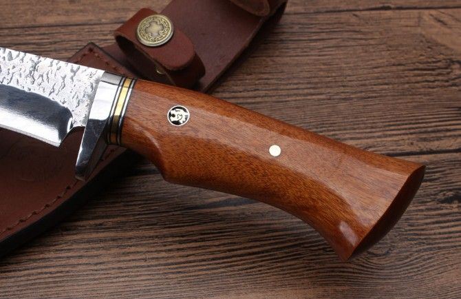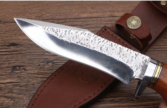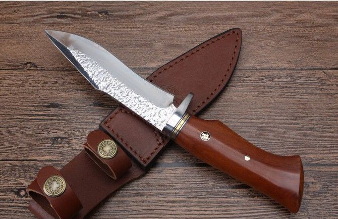 KJ034扎花镜光匕首 全长:26.3cm 刃长:13.6cm 刃宽:3.5cm 刃厚:5.1mm 柄长:12.9cm 刃材:8CR18MOV(锻打) 硬度:58HRC 总重:482克(含皮套) 表面:锻打纹+刃口镜光 柄材:护手钢头花梨木 其他:牛皮刀套礼品盒