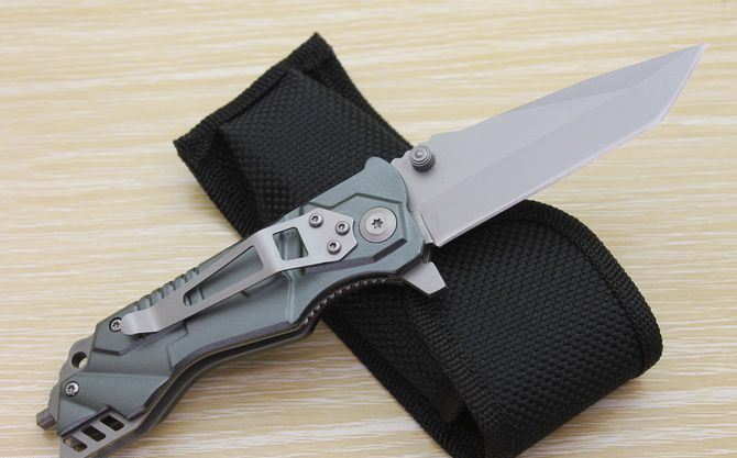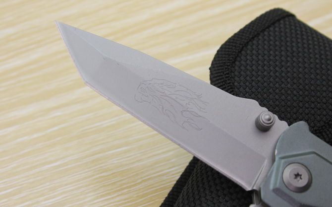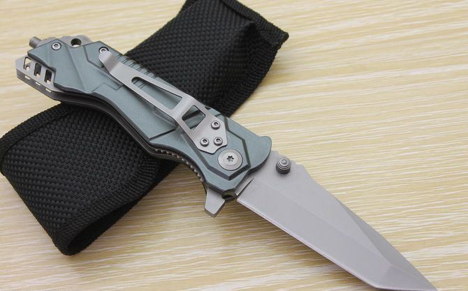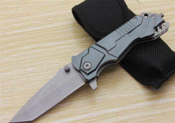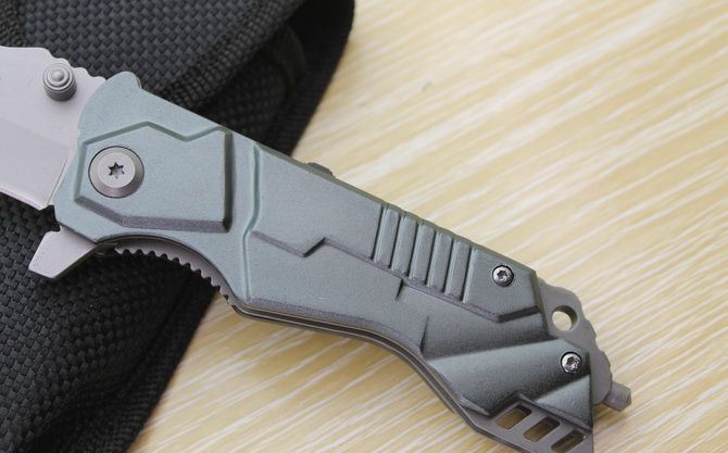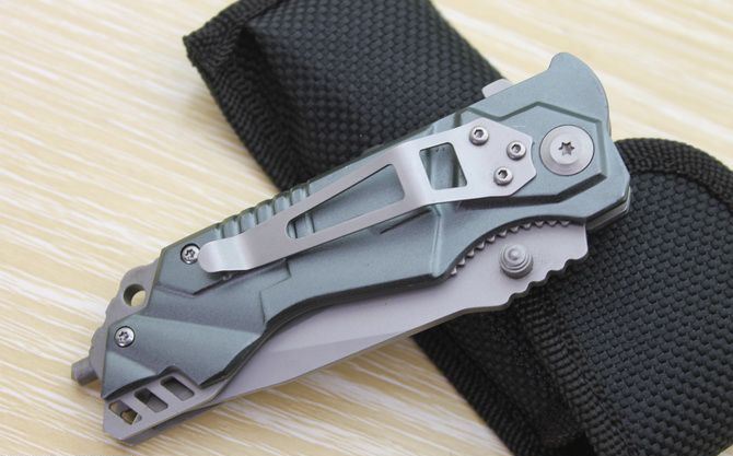 478灰钛折刀 全长:20.5cm 刃长:9cm 柄长:11.5cm 刃宽:3cm 刃厚:2.8mm 钢材:420 硬度:57HRC 重量:180克(含包装) 表面:灰色 柄材:铝片 锁型:助力(带保险锁) 包装:彩盒+牛津袋