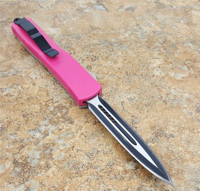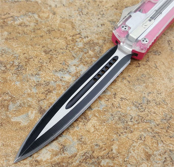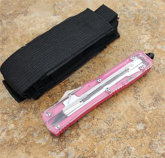 微技术ultratech121直跳刀双刃透视特别款粉红柄 全 长: 21.8cm 刃 长: 8.8cm 刃 厚: 3mm 刃 宽: 1.5cm 柄 长: 12.5cm 刃 材: 440C 硬 度: 58 (超高硬度,非常锋利) 净 重: 95g 毛 重: 128g(含包装) 表 面: 拉丝 柄 材: 铝合金+树脂纤维盖 刀 套: nylon 锁 闭: 直出弹簧刀 备 注: 带玻璃锥、腰夹,专用维护工具