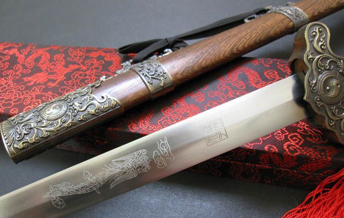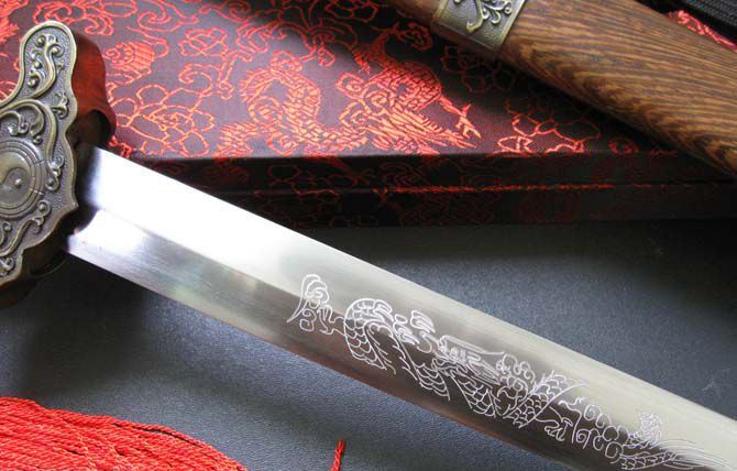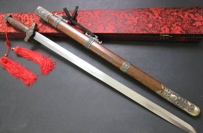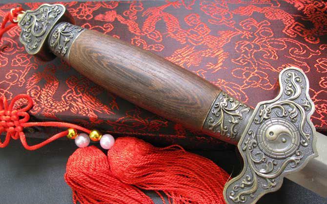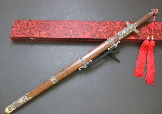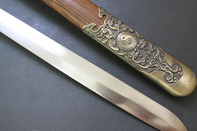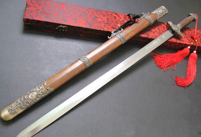 武当太极剑 全长:103.0 厘米 剑长:76.0 厘米 柄长:24.5厘米 剑宽:3.5厘米 厚度:0.84厘米 材质:高碳钢 工艺:经淬火,回火等热处理.手工锻造研磨开刃. 硬度:57HRC 鞘材:花梨木 装材:锌铝合金装具 柄材:花梨木 剑重:1580.0克(含鞘) 整套:2520.0克(含锦盒) 备注:配锦盒