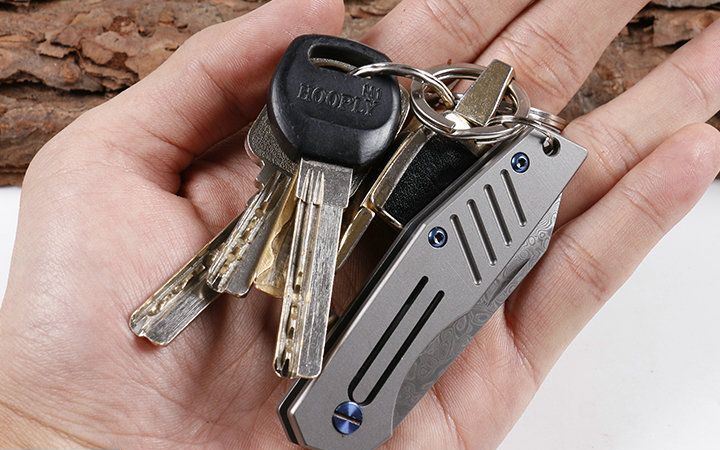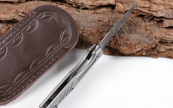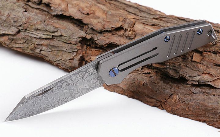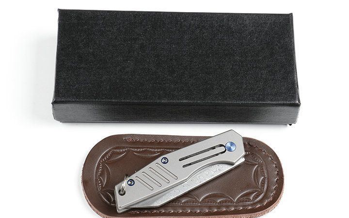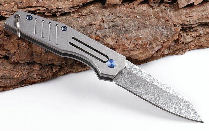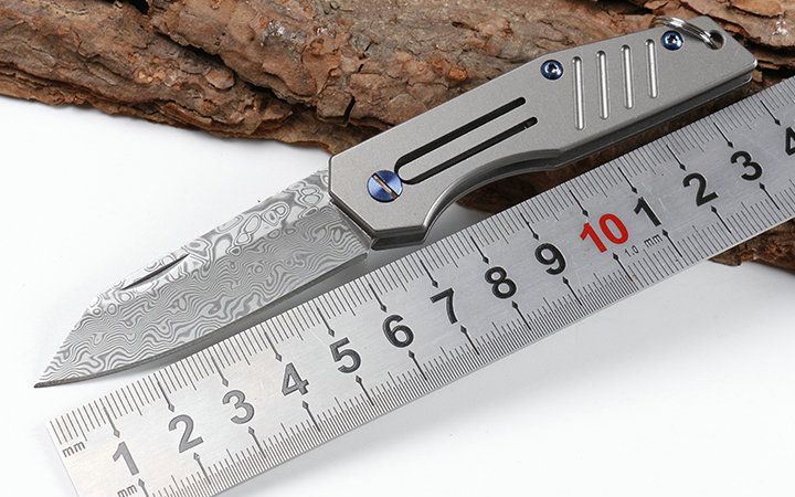 迷你鲸沙大马士革小匙刀 全长:14.1cm 刃长:6.2cm 柄长:7.9cm 刃宽:1.7cm 刃厚:2.9mm 刃材:VG10大马士革 重量:92g(含包装) 硬度:58-60HRC 表面:灰钛 柄材:钛柄 锁型:玻珠位定锁,CNC成型 其它:开合流畅,包装礼品盒+真皮套