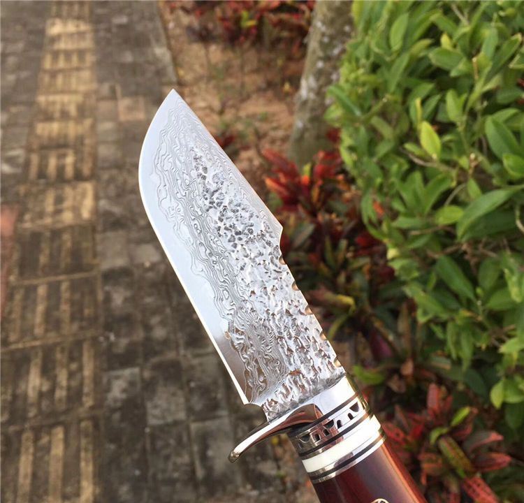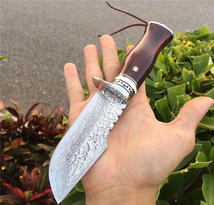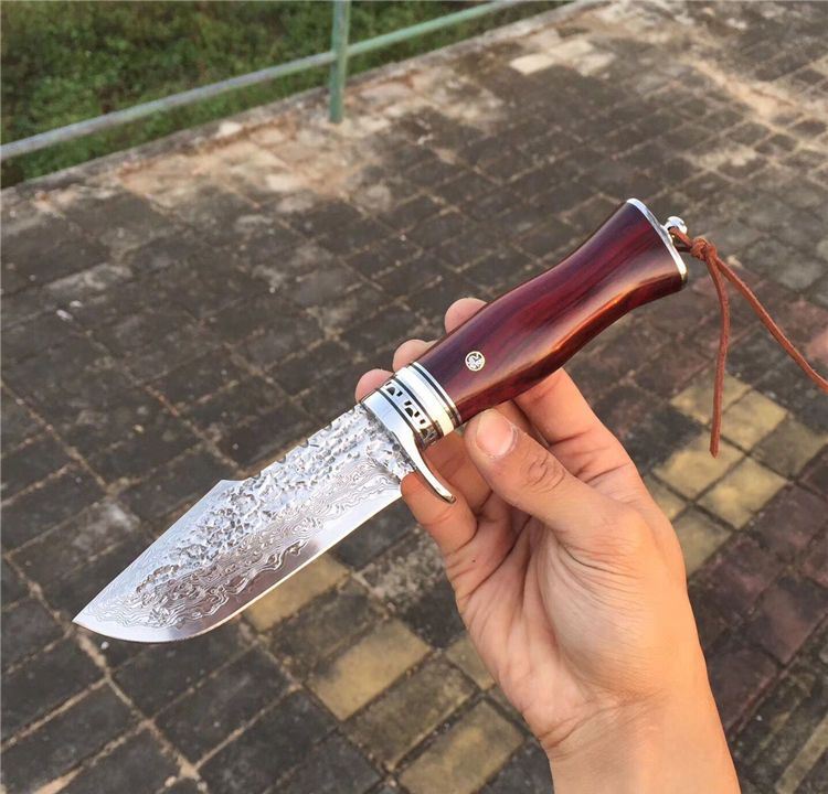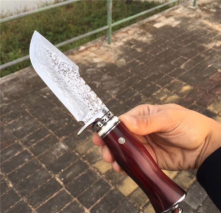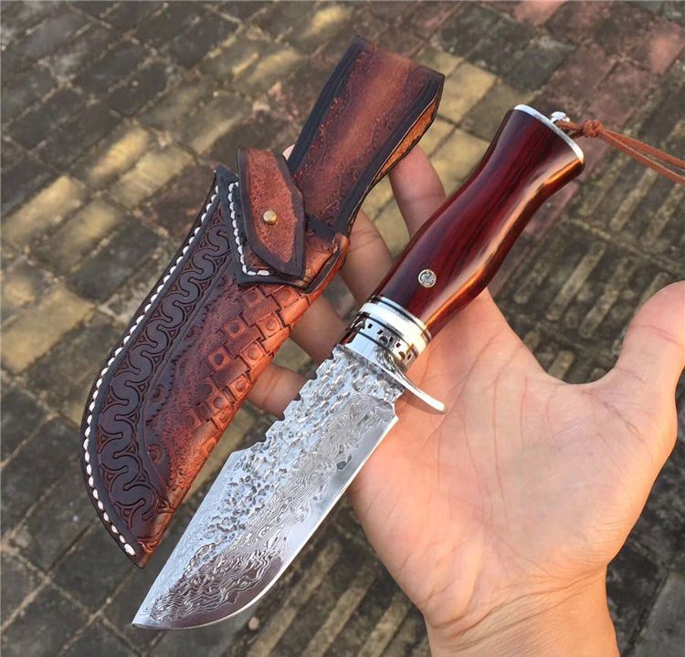 奥丁旱士大马士革猎刀 全长:24cm 刃长:11cm 刃材:大马士革钢VG10 硬度:60HRC 刃厚度:3.8MM 手柄材料:白钢护手+牛古隔片+紫檀木 配复古雕花牛皮刀套 大叶紫檀木粗料手工制作、配纯手工缝制雕花牛皮刀套、高端大气款、二次水冷开刃、可刮腿毛、刀刃钢材大马士革钢、超强硬度、真空热处理韧性好