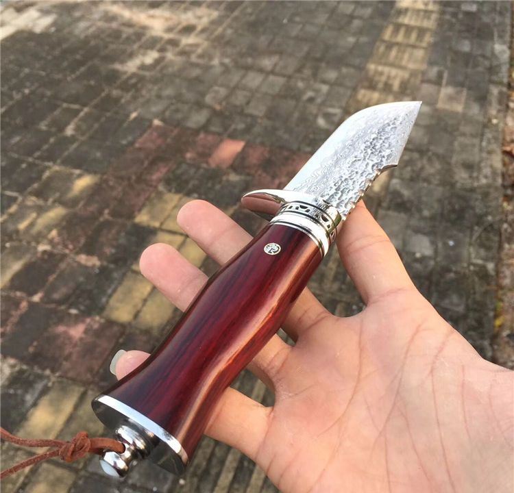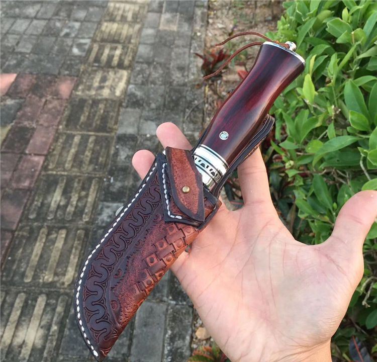 大叶紫檀木粗料手工制作、配纯手工缝制雕花牛皮刀套、高端大气款、二次水冷开刃、可刮腿毛、刀刃钢材大马士革钢、超强硬度、真空热处理韧性好