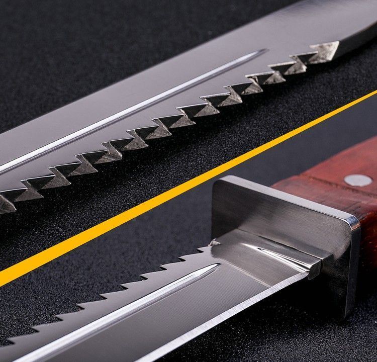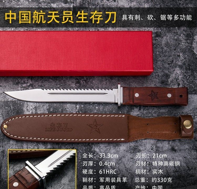 中国航天员生存刀 全长:33.3cm 刃长:21cm 厚度:0.4cm 宽度:2.5cm 材质:特种高碳钢 硬度:61HRC 中国航天员由于着陆地的误差而装备的野外生存刀。同时装备我国的歼十战斗机飞行员,也叫“飞行员多用途救生刀”这把刀平时放在弹射座椅的救生包里,一旦战斗机失事或被击落,可以用于荒野求生。