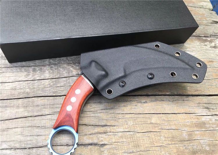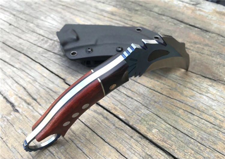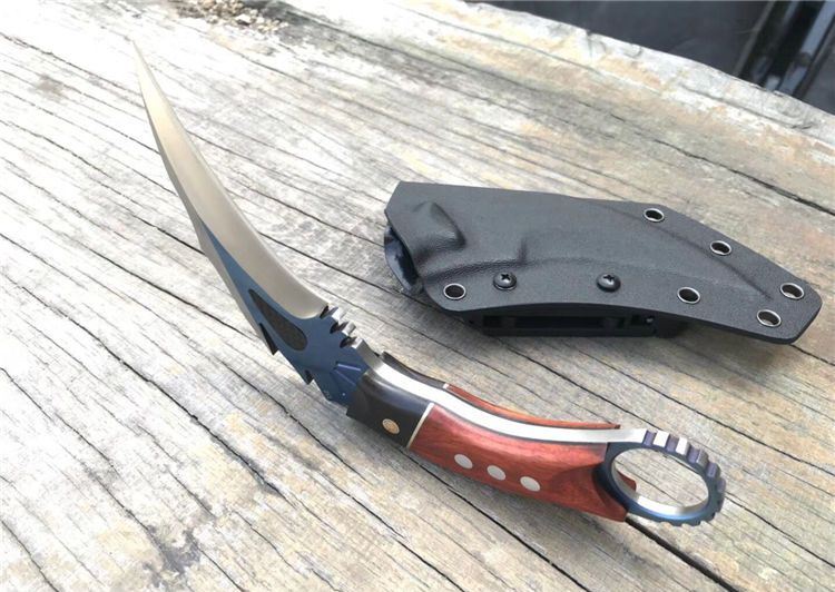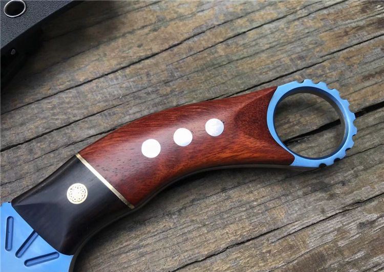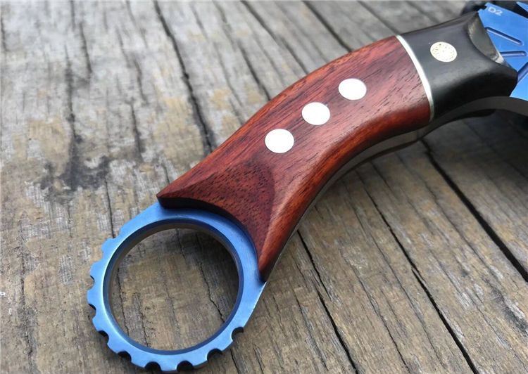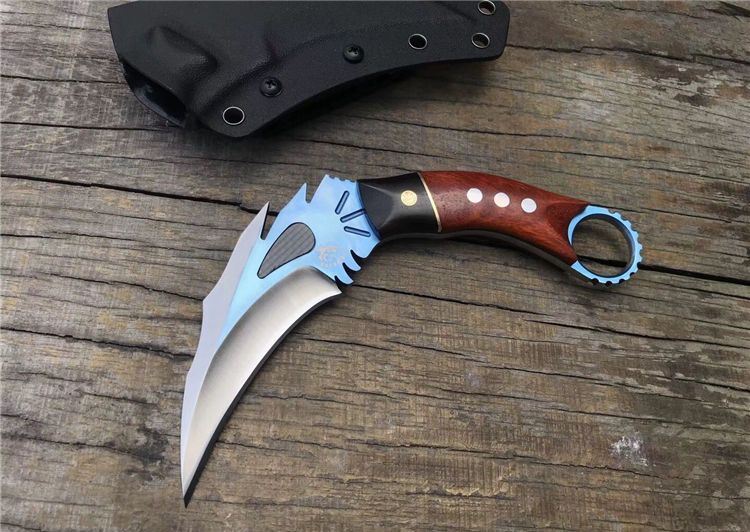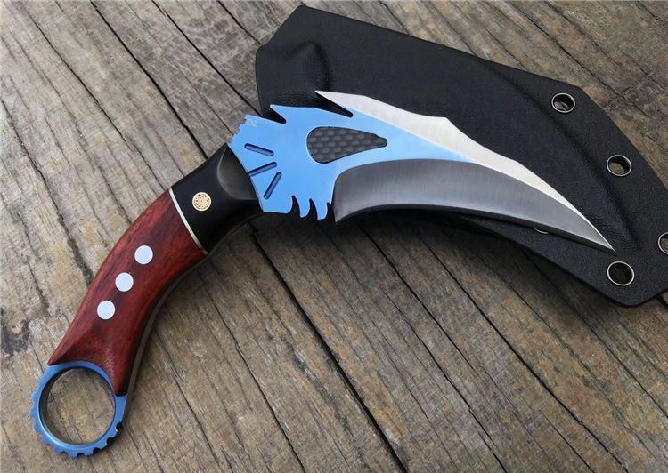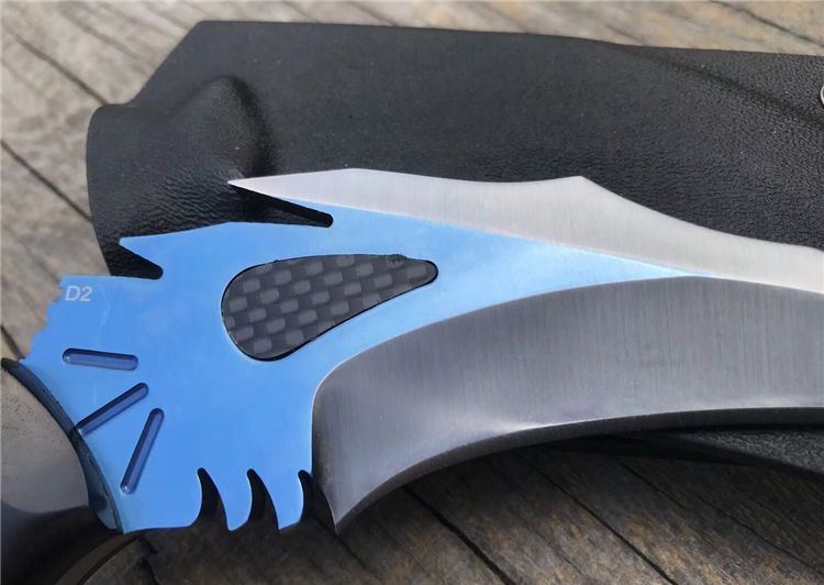 THE ONE不死鸟手工爪子蓝色 全长:20CM 刃长:9CM 柄长:9.4CM 刃厚:0.5CM 刃材料:D2 硬度:59-60HRC 表面:碳纤+镀钛 刀套:美国进口Kydex 重量:300克(带鞘) 刀柄:黑檀木+铜片+科檀木+G10片 其它:配精品礼品盒