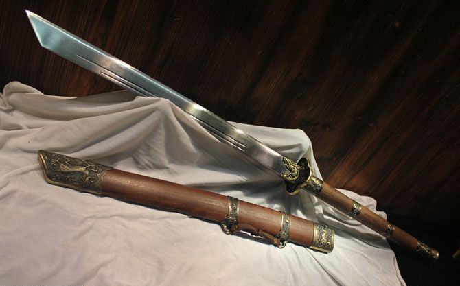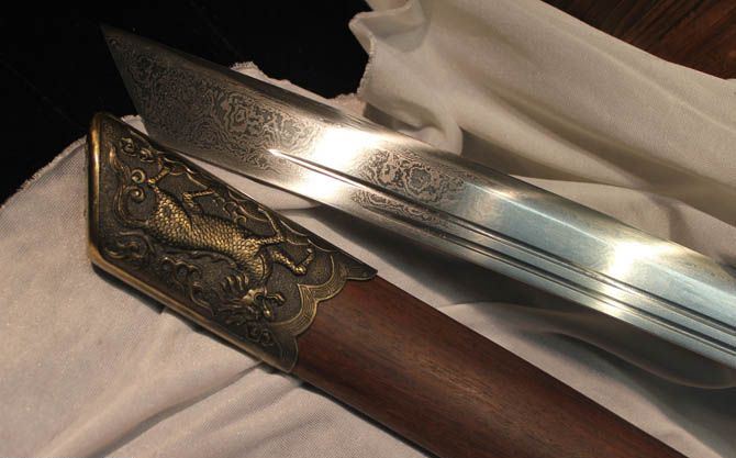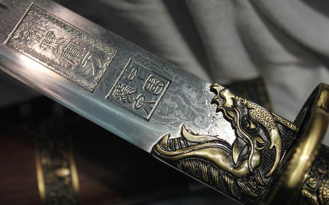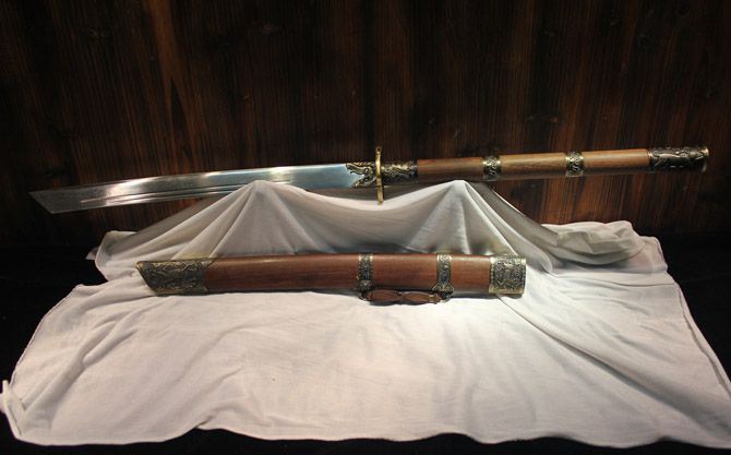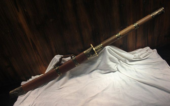 全 长:90cm 刃 长:48cm 柄 长:40cm 刃 宽:3.7cm 刃 厚:0.75cm 刃 材:花纹钢热处理 柄 材:硬木 装 材:仿青铜手工雕刻 鞘 材:花梨木 全 重:2000g 鞘 重:660g 加工工艺:精炼地基钢,手工锻打,传统古法研磨。12道研磨 硬度区间:刃口硬度60HRC;刀身硬度:55HRC 性 能:全开锋 削纸断竹 砍铁丝 备 注:带刀袋,刀架。