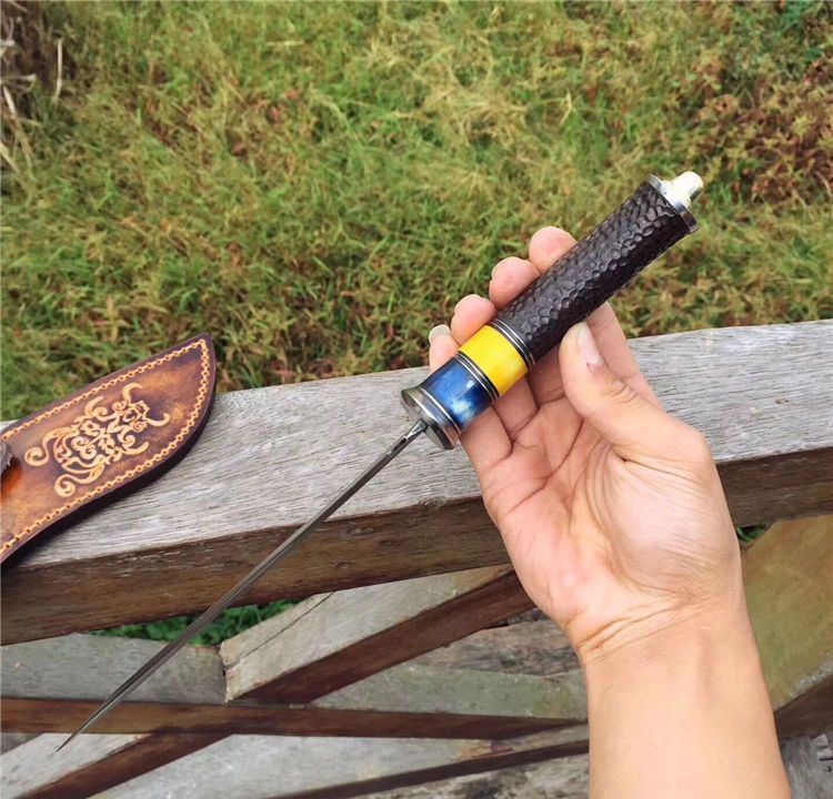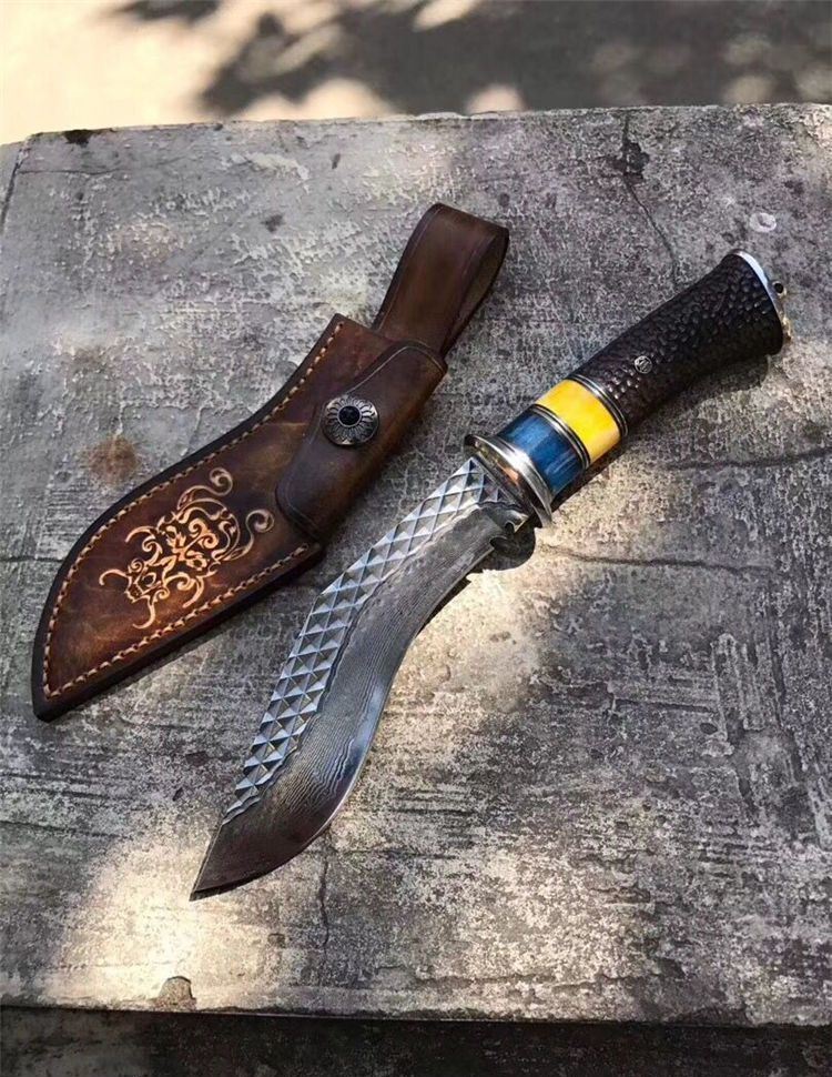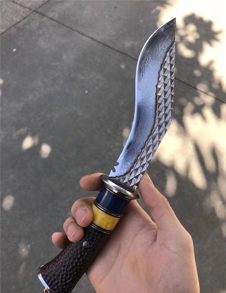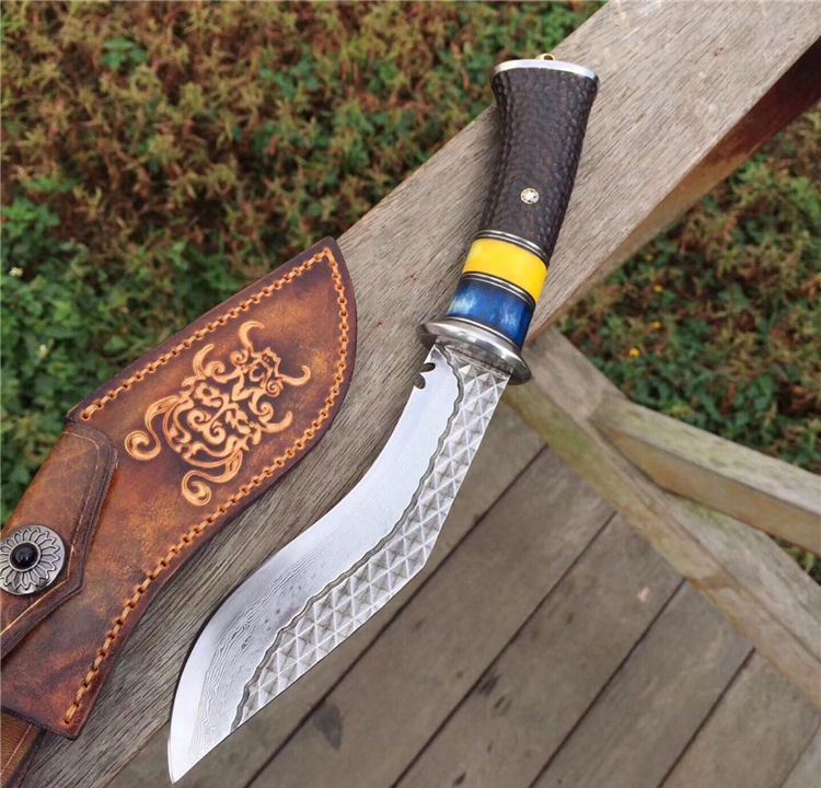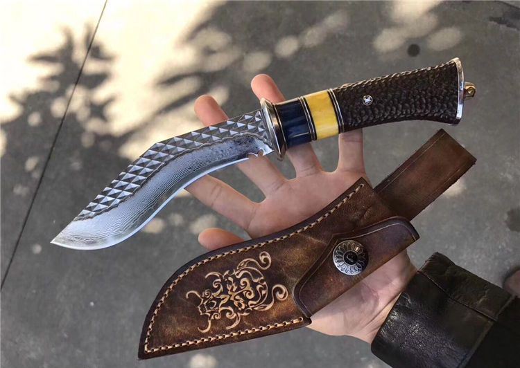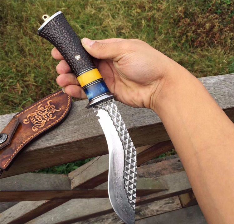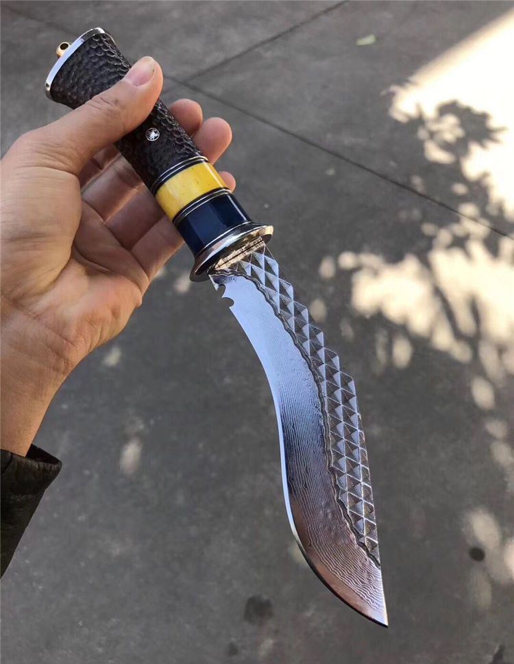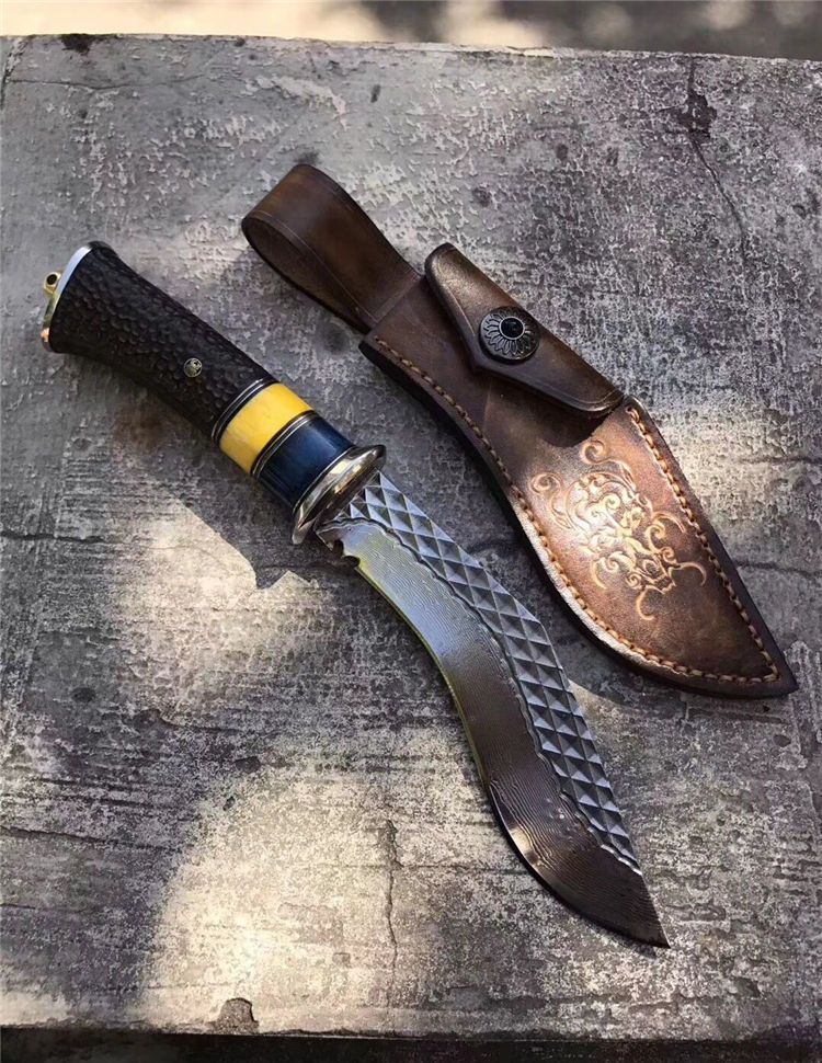 户撒大马士革尼泊尔弯刀 总长:29cm 刃长:16cm 手柄长:13cm 刃厚度:4mm 刃钢材:大马士革钢 手柄材质:白钢头+蓝牛骨+黄牛骨+黑檀木雕刻 包装配置:高端植鞣牛皮刀套+礼品包装盒