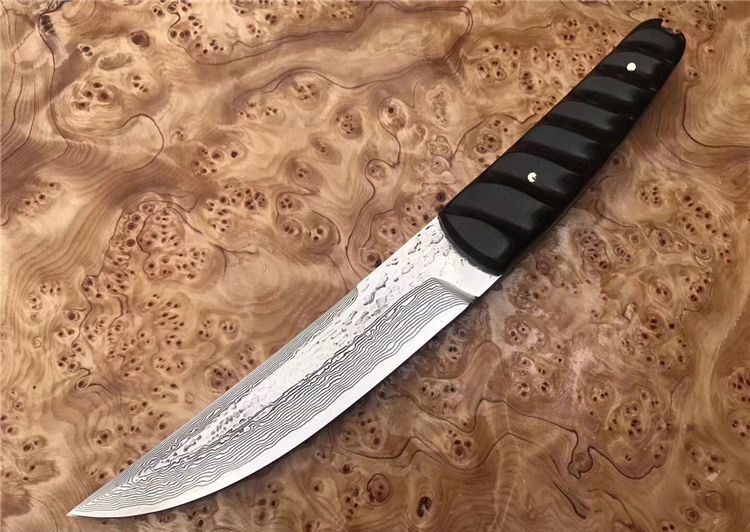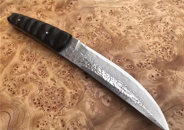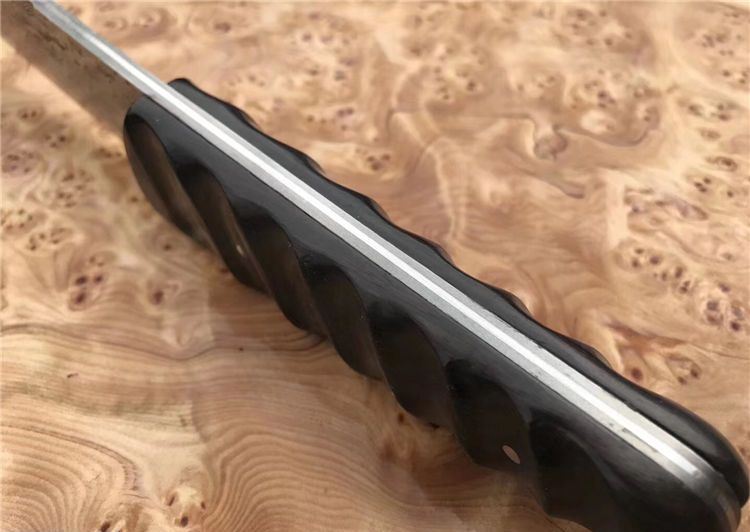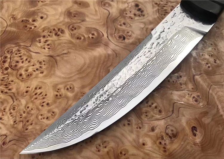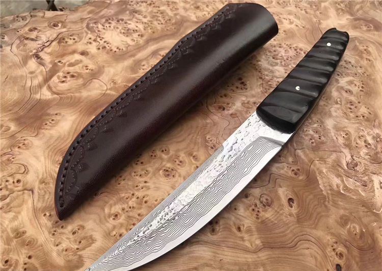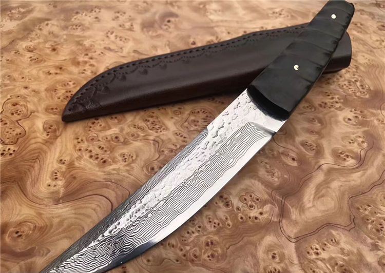 诛杀版甲斐之虎一体大马士革直刀 总长:26.5cm 刃长:15cm 手柄长:11.5cm 刃钢材:进口大马士革钢VG10一体钢(高温处理) 刃厚度:4MM 硬度:60HRC 手柄材质:黑檀木 皮套/包装:手工缝制植鞣牛皮刀套+精美包装盒