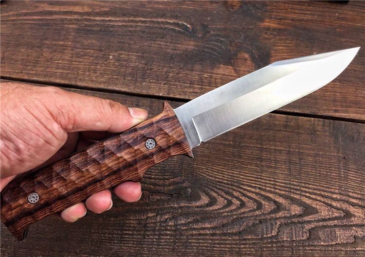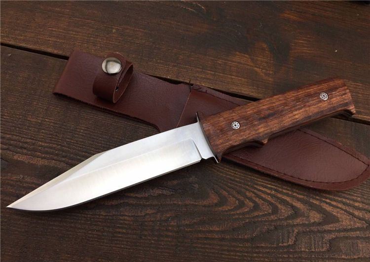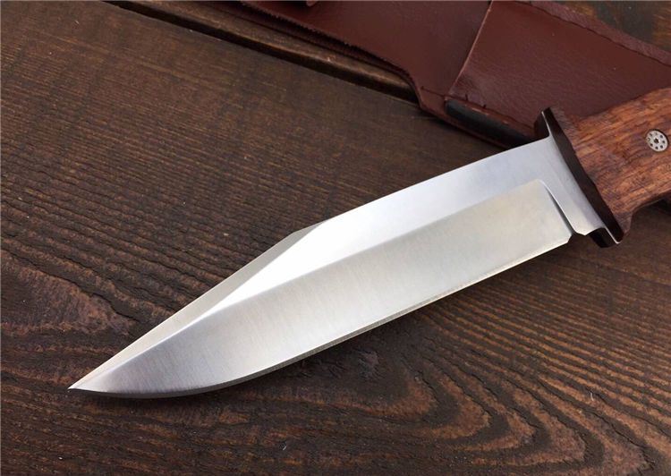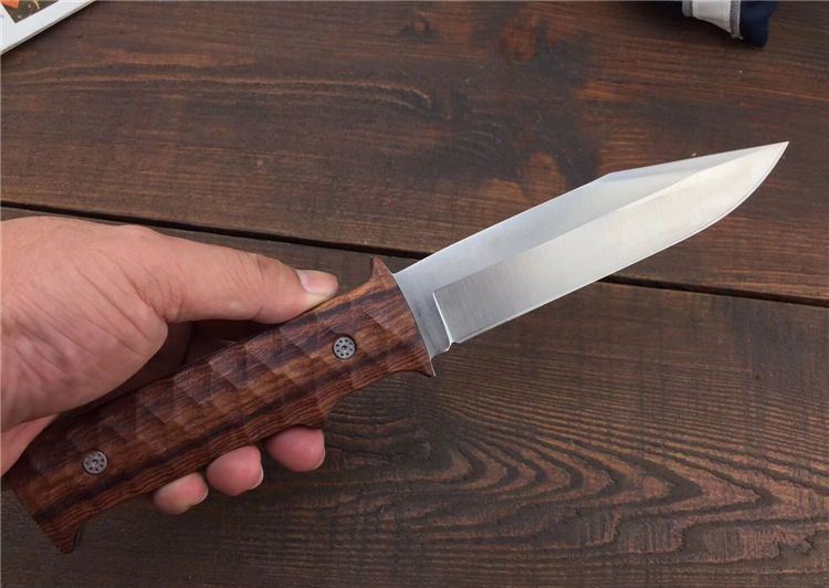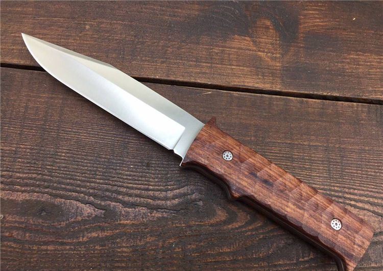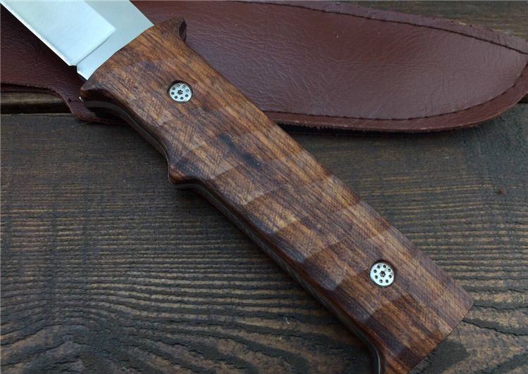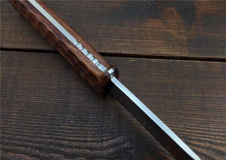 酸枝木小直刀 刃材:8CR13 柄材:酸枝木 全长:28CM 刃长:13.5CM 刃厚:0.4CM 硬度:57左右 重量:280G 表面处理:砂光 配皮套