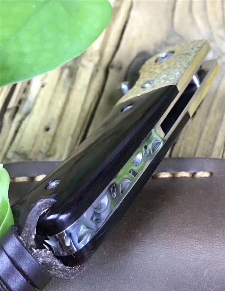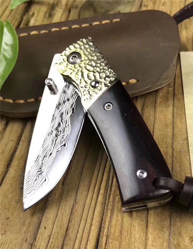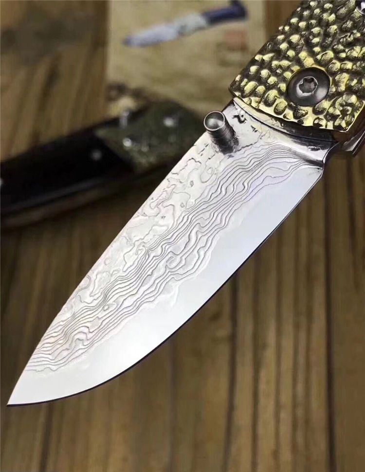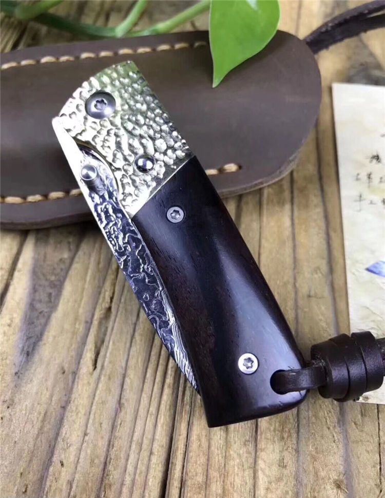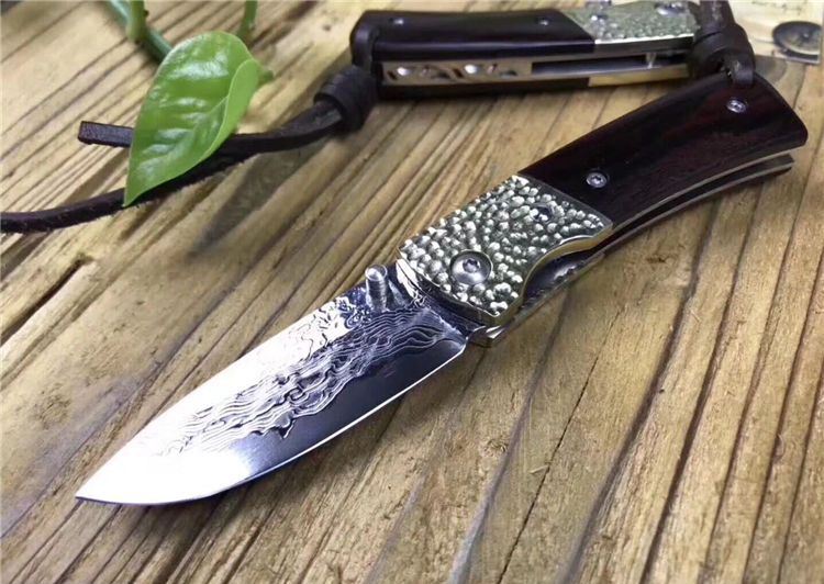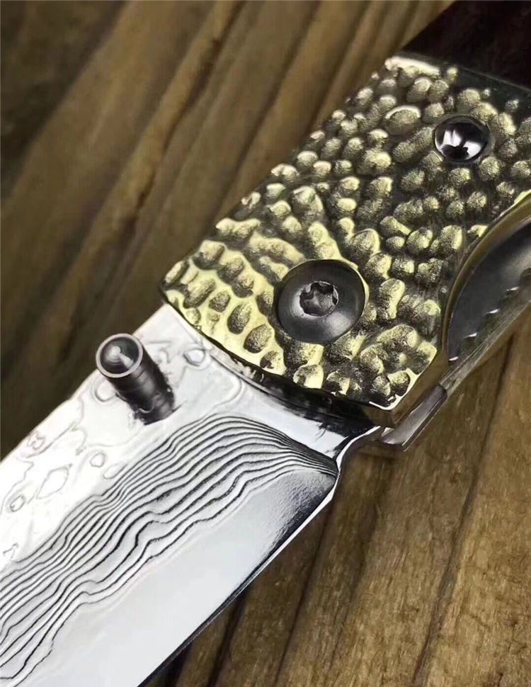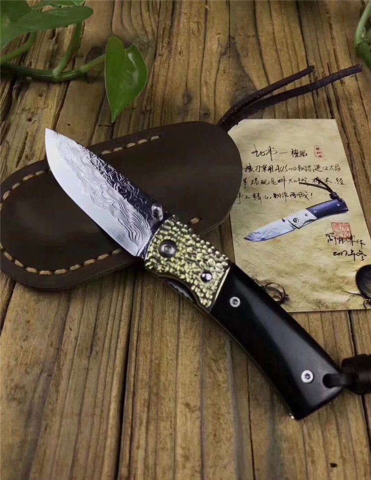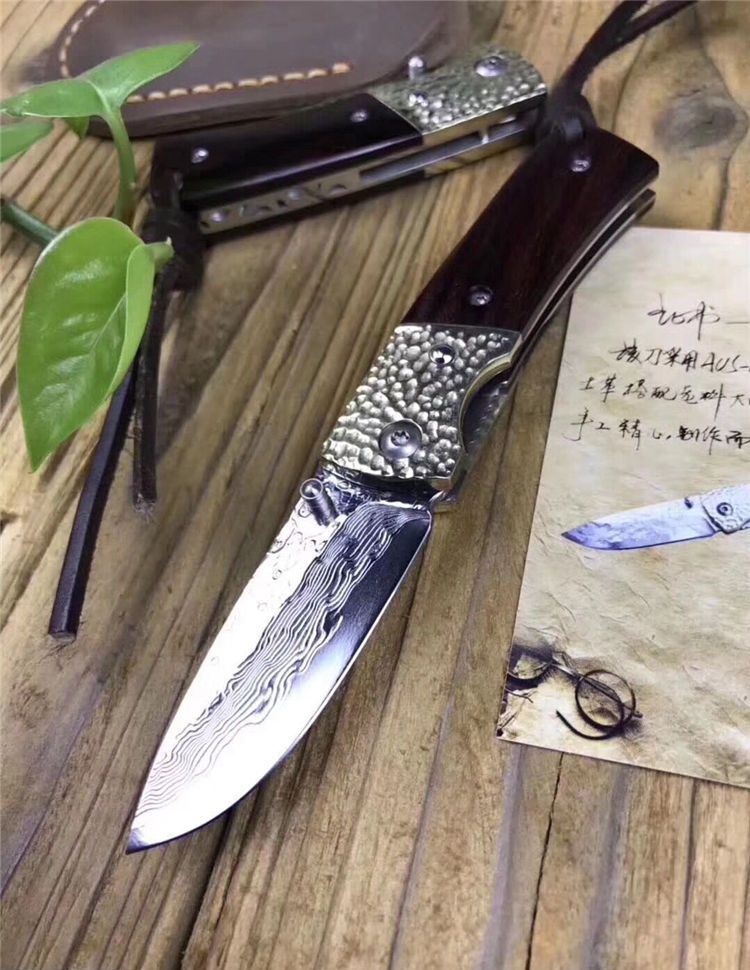 简师傅檀郎大马士革折刀 全长:13cm 刃长:5.6cm 柄长:7.4cm 刃厚:2.0mm 刃材:AUS-10刃钢进口大马士革 刀柄:黄铜搭配老料大叶紫檀木 锁定方式:线锁 随刀附赠简师傅亲笔证书、头层牛皮刀套,精品复古礼盒包装