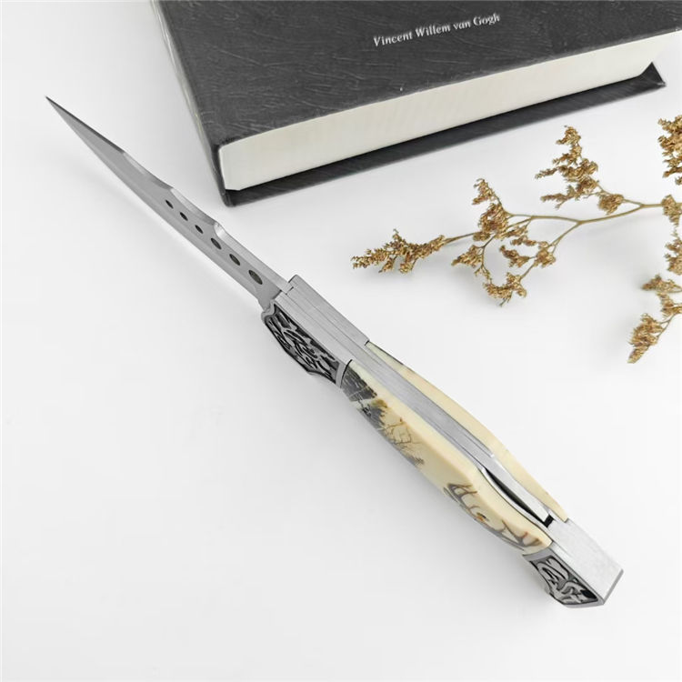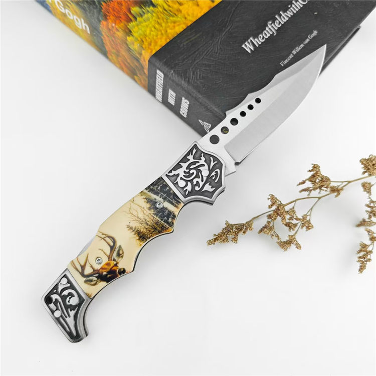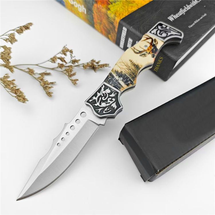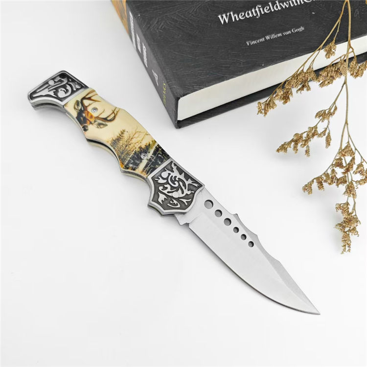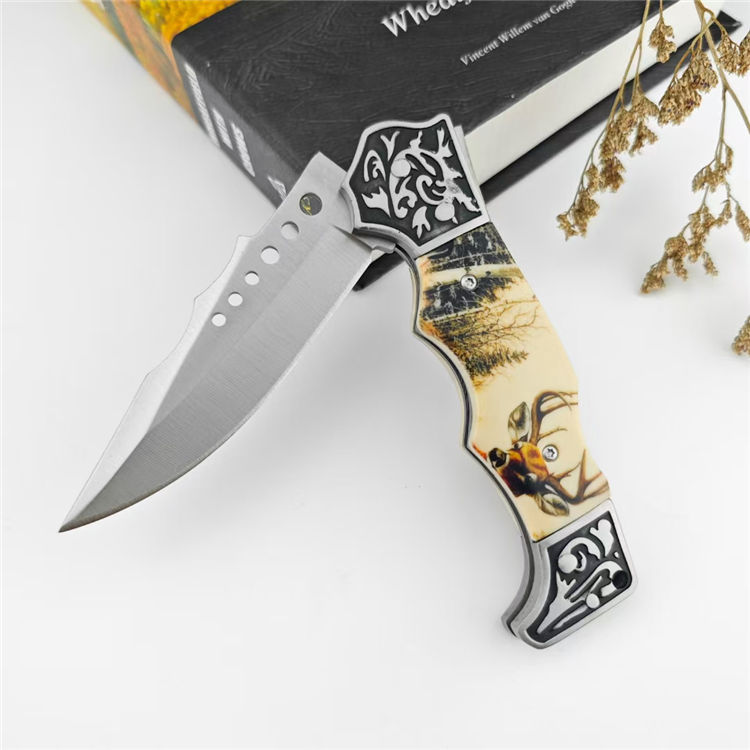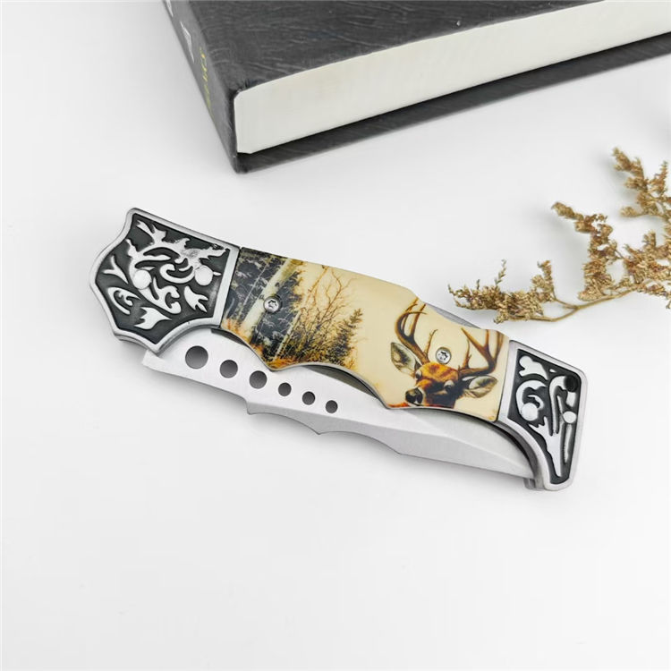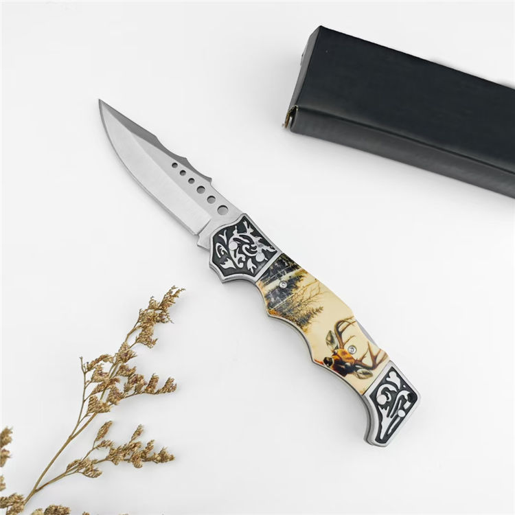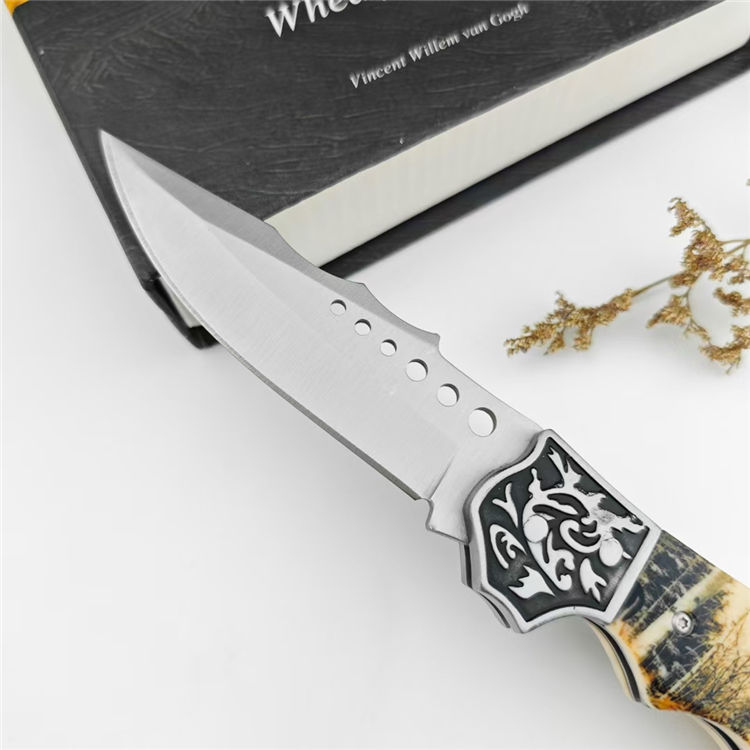 新款梅花鹿折刀 全 长:23cm 刃 长:10cm 刃 宽:2.2cm(最宽处) 刀 柄:13cm 硬 度:57HRC 刃 厚:0.29cm 重 量:250克 表 面:镜光 刃 材:440C 锁 闭:传统式制尾锁 其 他:尼龙套包装