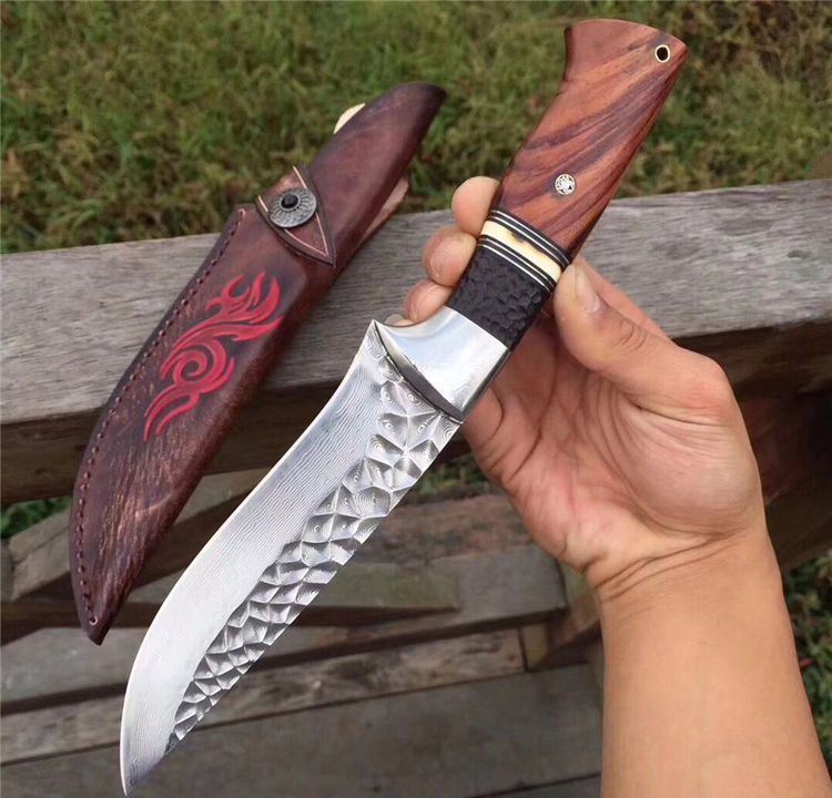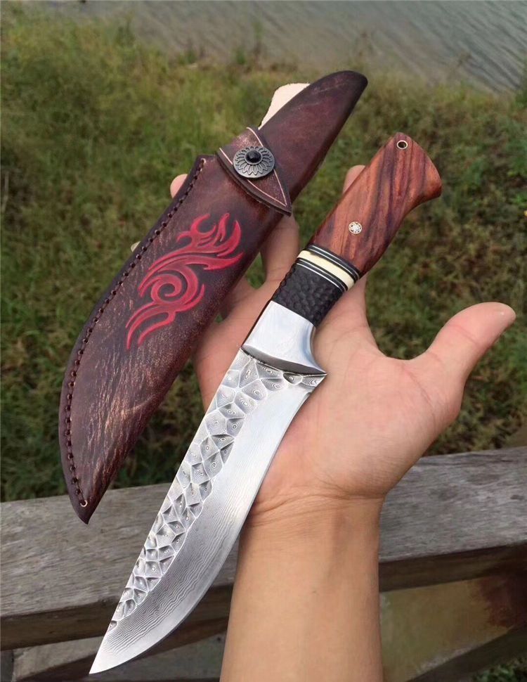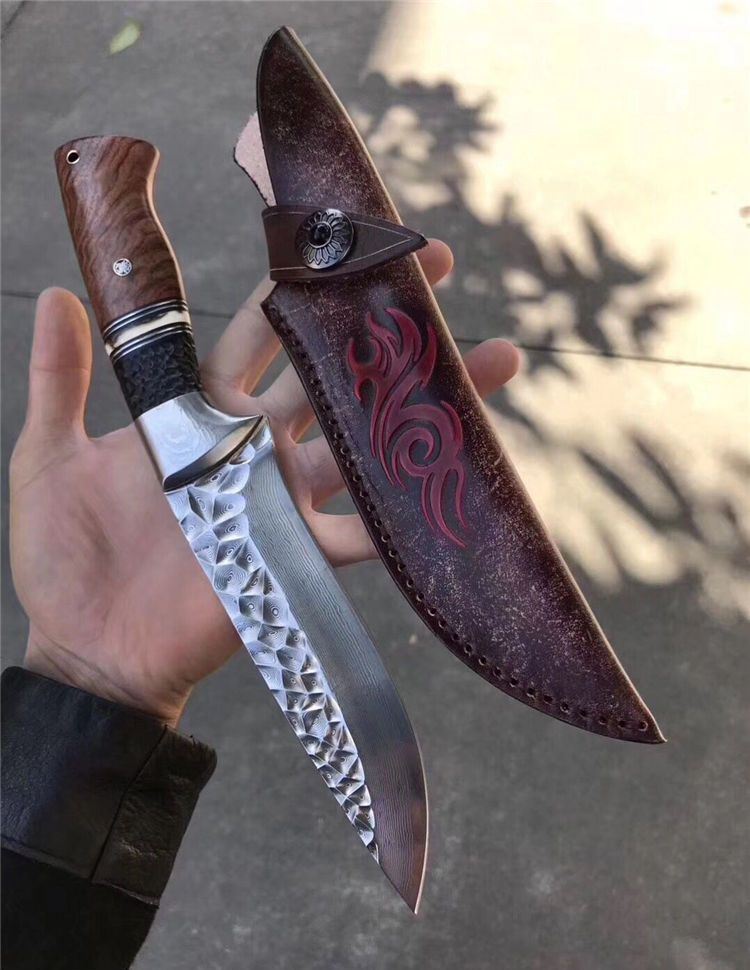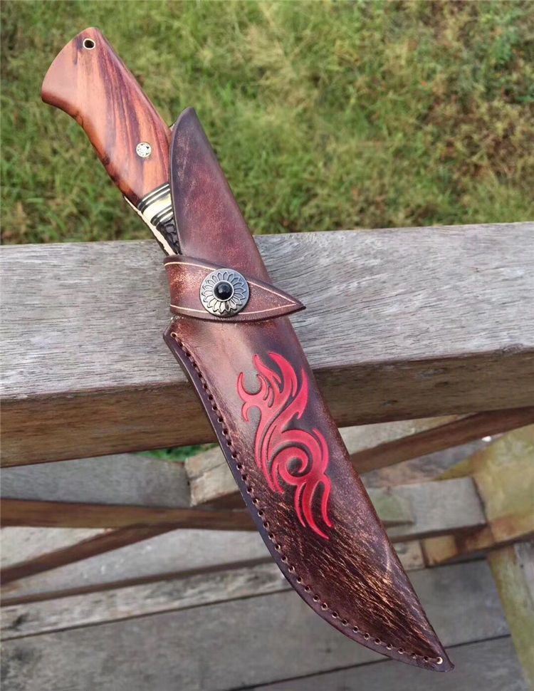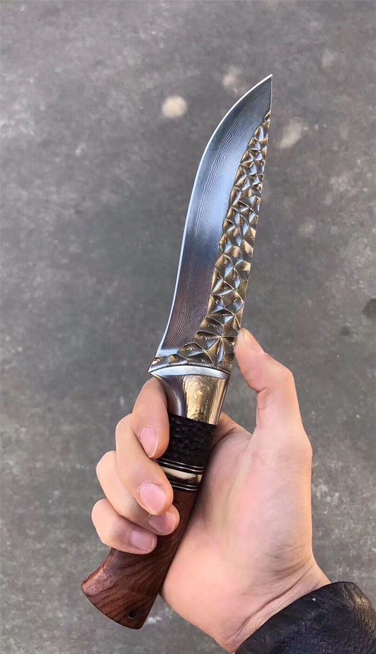 高端仁者大马士革直刀 全长:275mm 刃长:145mm 刃厚:4.3mm 刃宽:40mm 柄长:130mm 刃材:进口VG10芯大马士革钢 净重:约260g 硬度:60 柄材:巴西花梨木+猛犸象牙+非洲黑檀 皮套:手工压花进口植鞣牛皮鞘