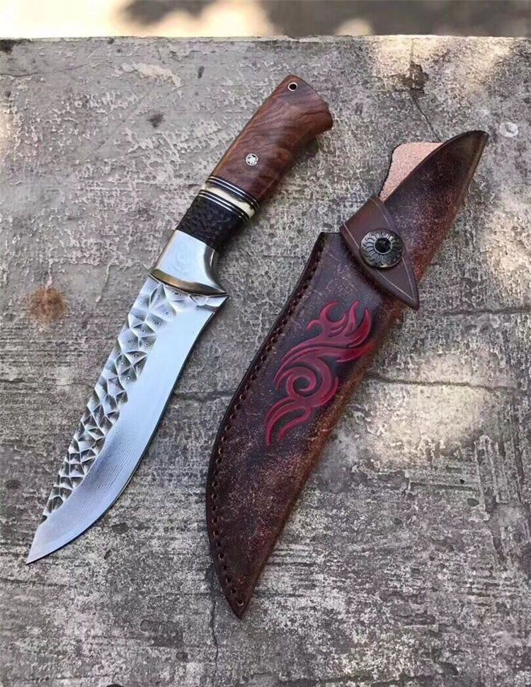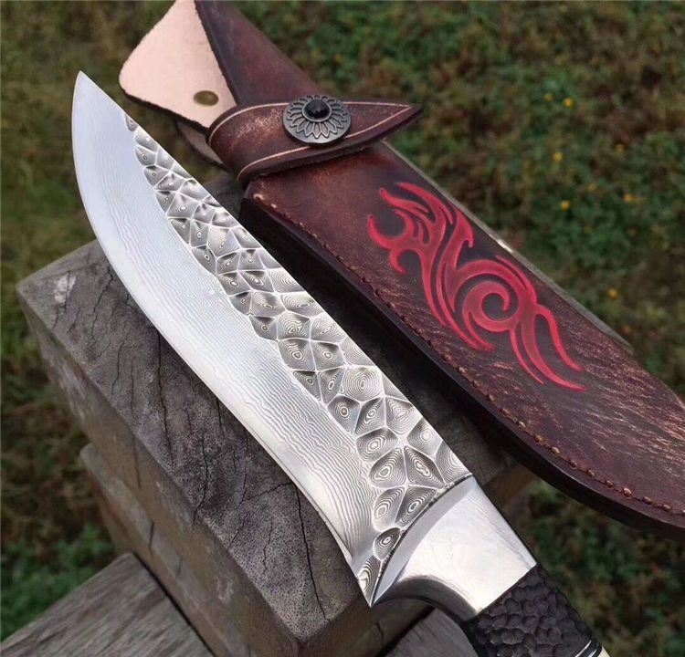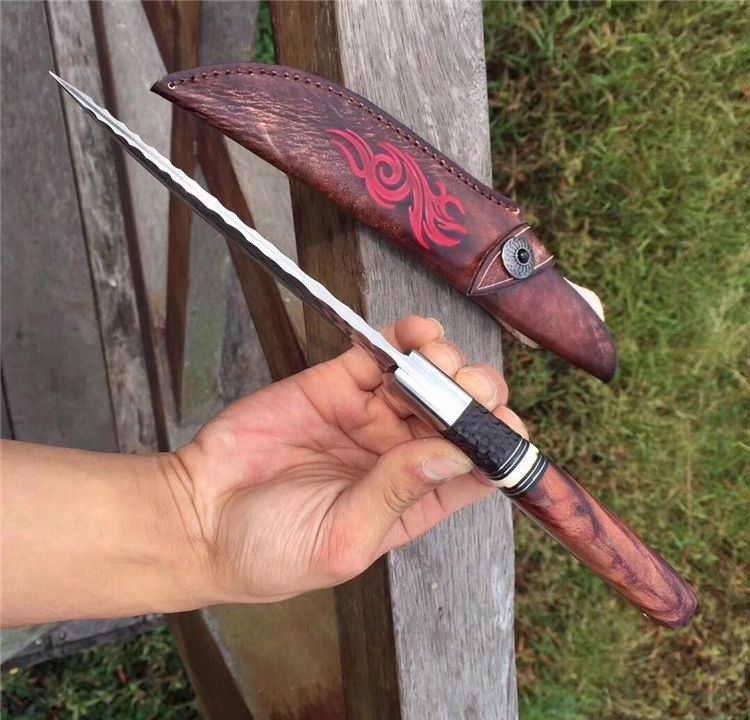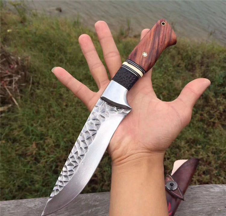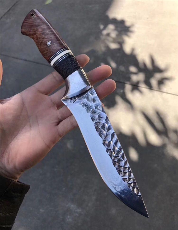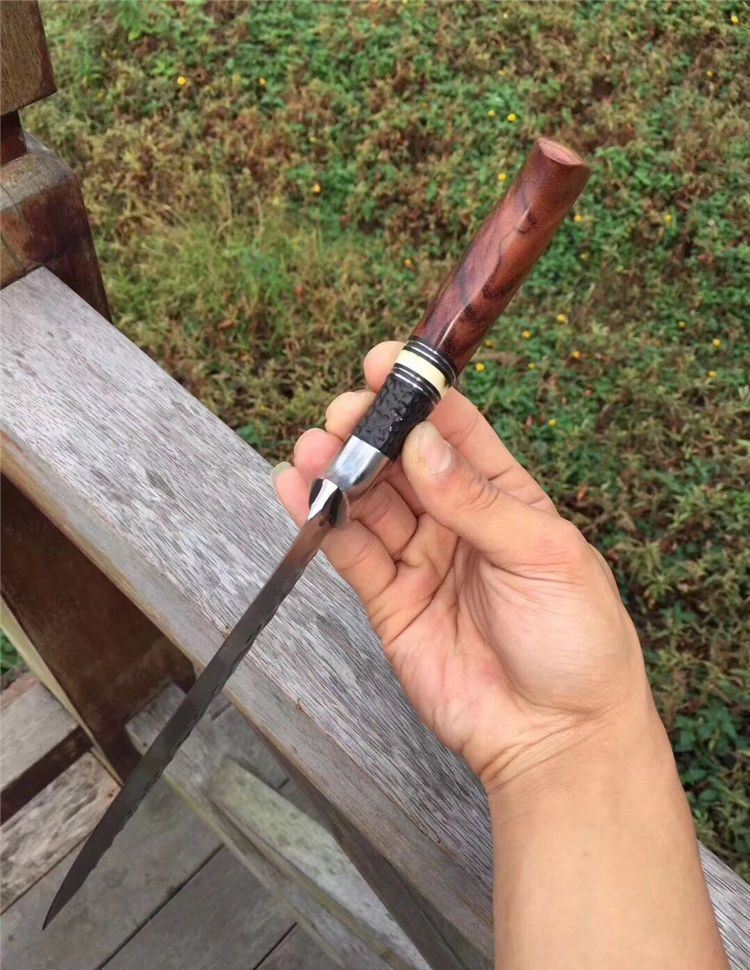 高端仁者大马士革直刀 全长:275mm 刃长:145mm 刃厚:4.3mm 刃宽:40mm 柄长:130mm 刃材:进口VG10芯大马士革钢 净重:约260g 硬度:60 柄材:巴西花梨木+猛犸象牙+非洲黑檀 皮套:手工压花进口植鞣牛皮鞘