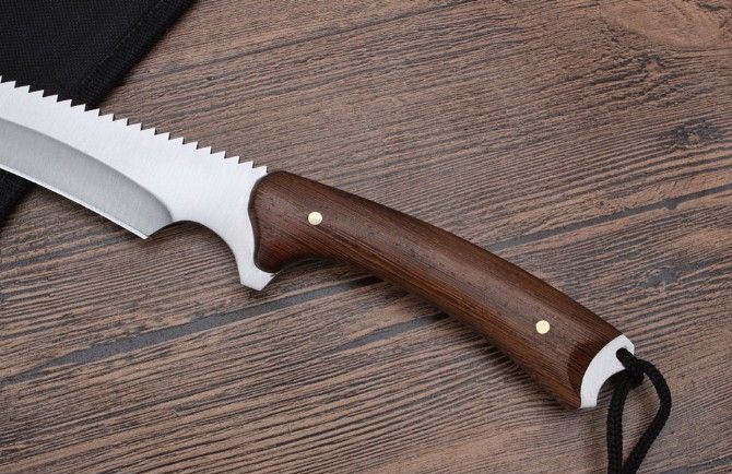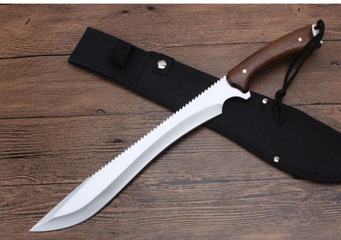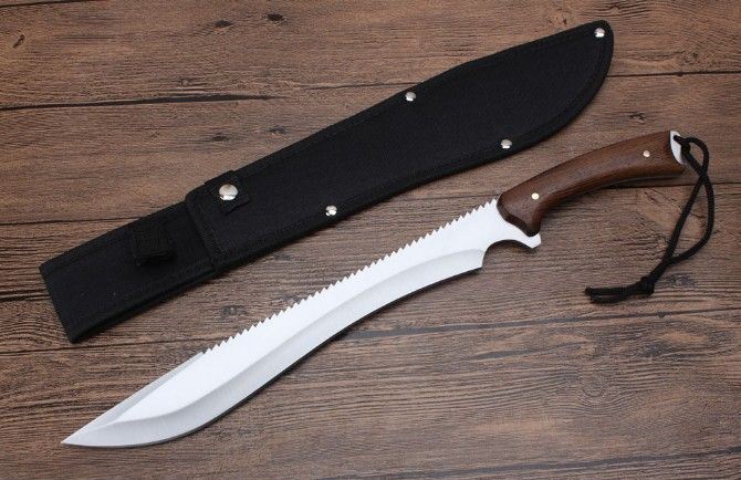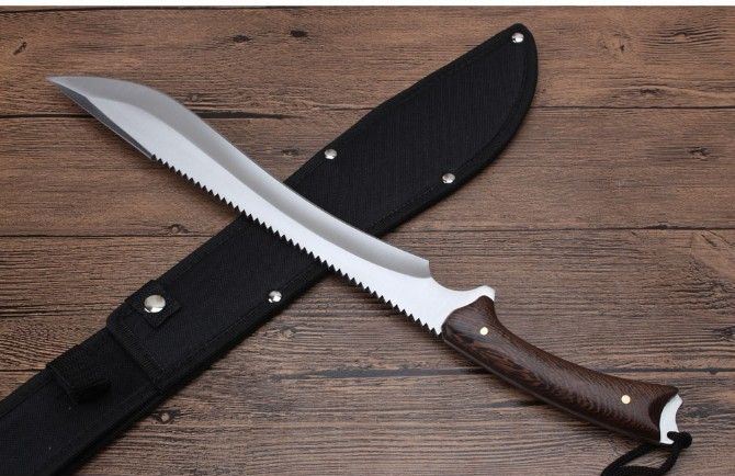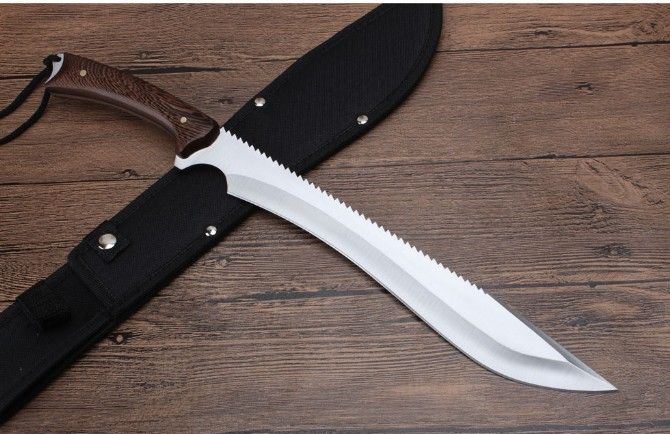 丛林探险救生刀 全长:436mm 刃长:300mm 柄长:135mm 刃宽:62mm 刃厚:0.42mm 刃材:5Cr13Wov 重量:431g(含刀套) 硬度:56HRC 表面:砂光 柄材:鸡翅木柄 锁型:定锁 其他:尼龙套