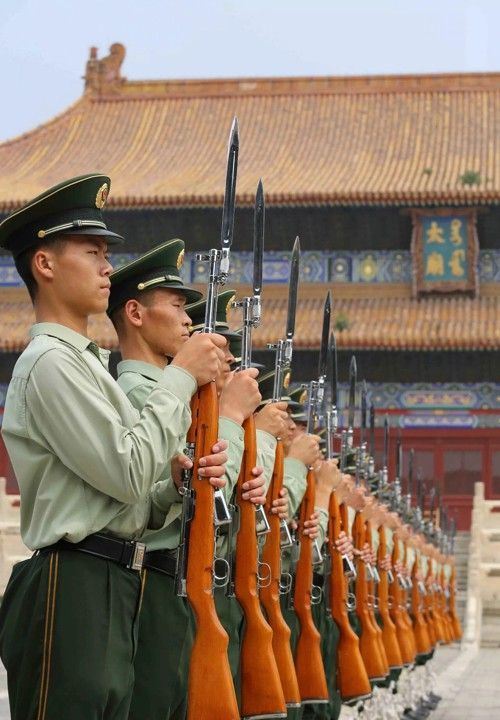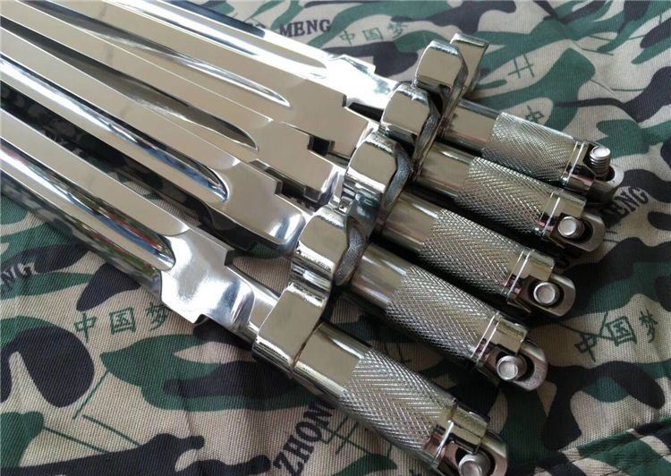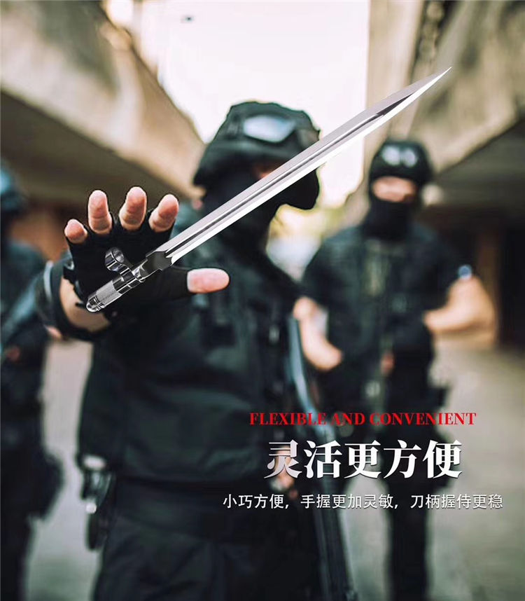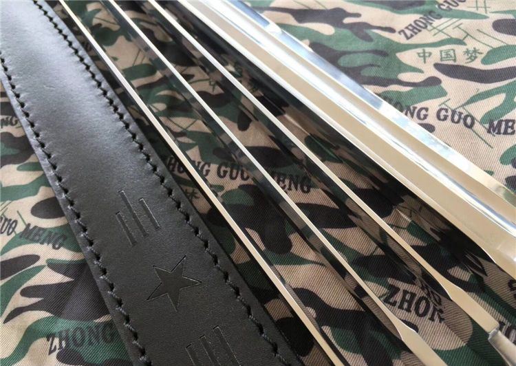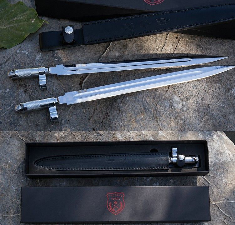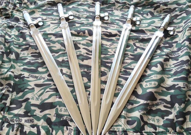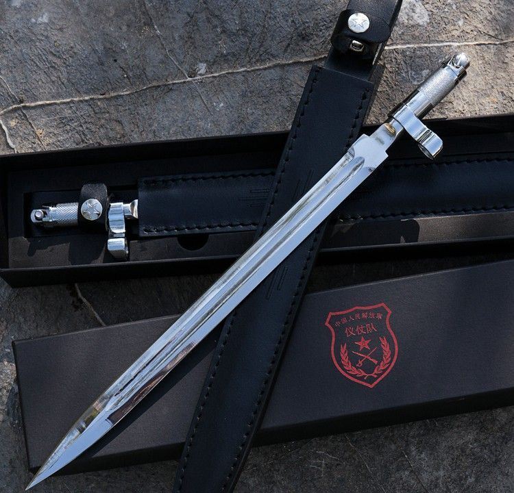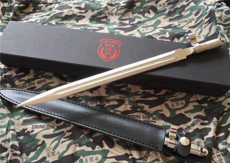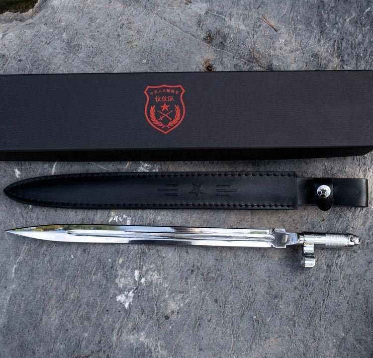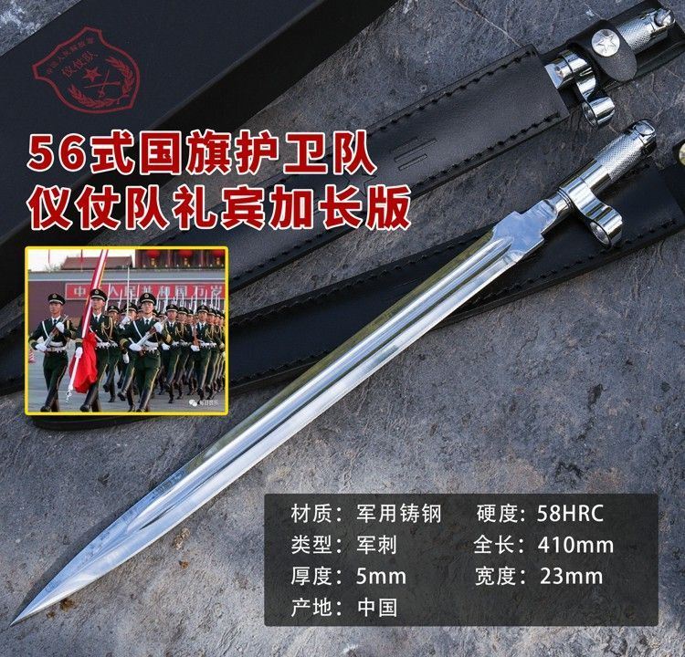 56式国旗护卫队仪仗队礼宾加长版军刺 全长: 410mm 厚度: 5mm 宽度: 23mm 材质: 军用铸钢 硬度: 58HRC 产地: 中国 56-1式半自动礼宾枪相对56式半自动步枪的区别是,增加了刺刀的长度,枪身配套刺刀是56式扁刺刀,铝合金材质,比标准的56扁刺刀长100毫米,表面超镜光。由于枪身原外露的发蓝部件、枪管的准星、枪刺等大部分采用了镜光工艺,使新版的礼宾枪金属感更强更醒目,视觉效果上也更光亮、威武,更能体现武警部队的威仪姿态,充分诠释我军军威和我国国威。