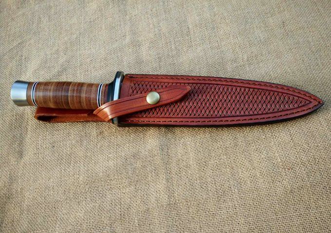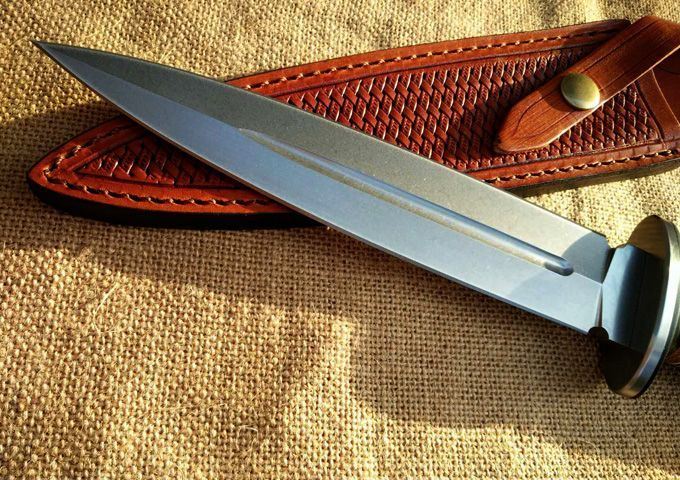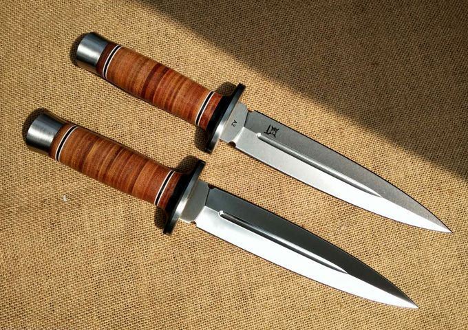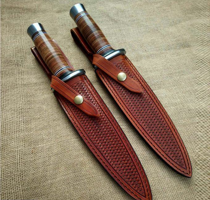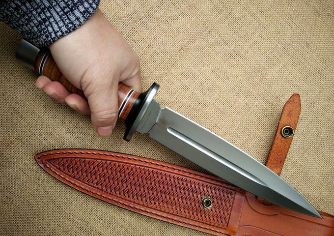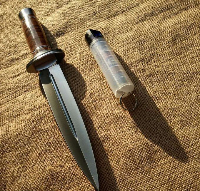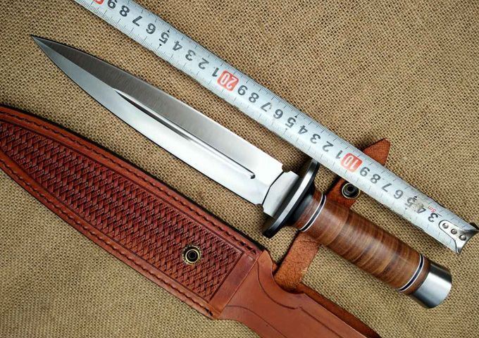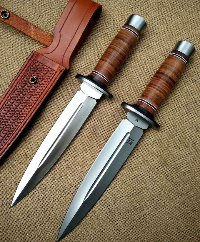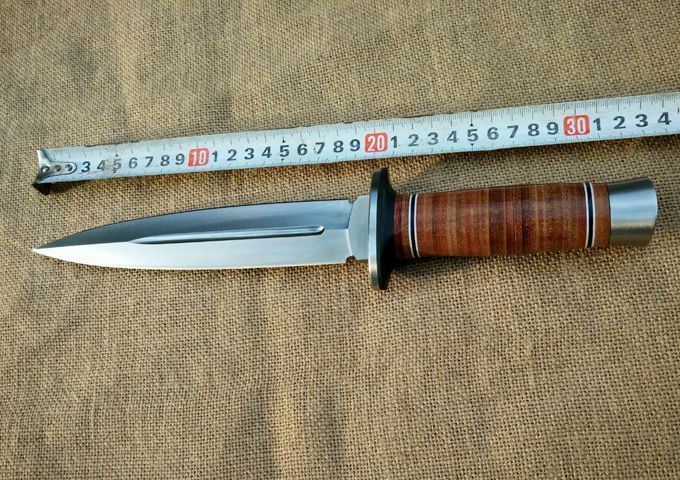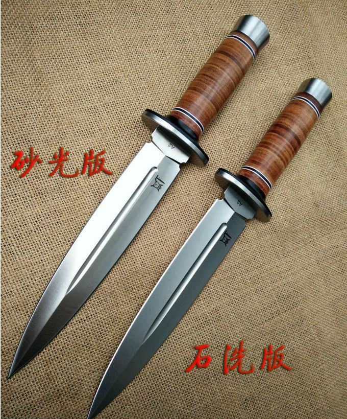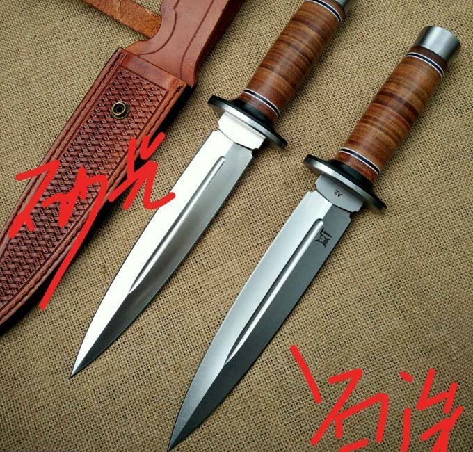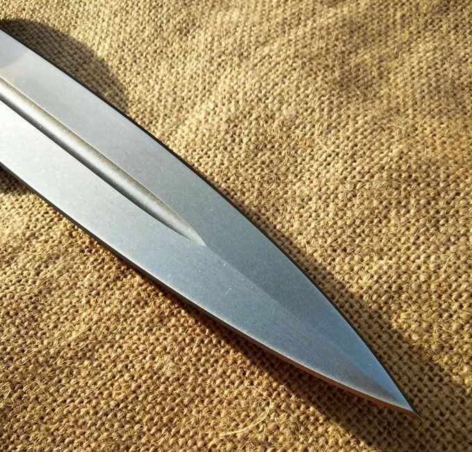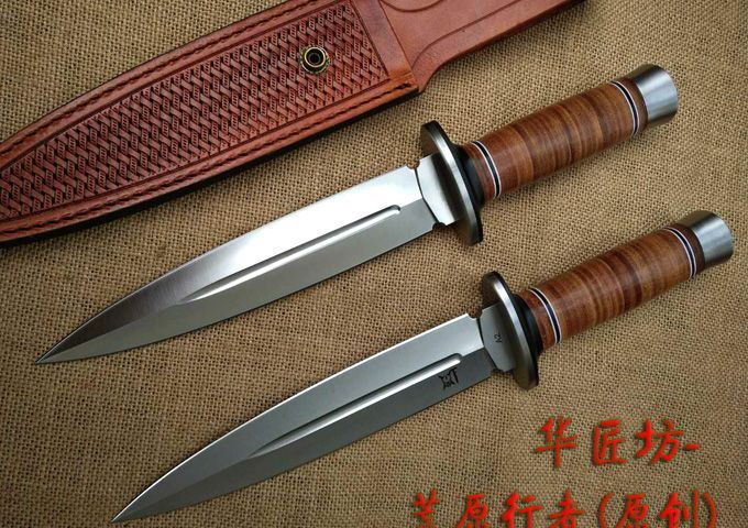 华匠坊荒原行者战术匕首 刃材:A2 全长:325MM 刃长:200MM 柄长:125MM 刃厚:5.2MM ,双刃设计 表面:砂光/石洗 硬度:60(真空油率,韧性比较好) 手柄:皮柄 净重:约360克 总重:约550克(包括刀鞘,包装盒等) 护手:不锈钢加G10 刀鞘:雕花植糅皮套 包装:礼盒