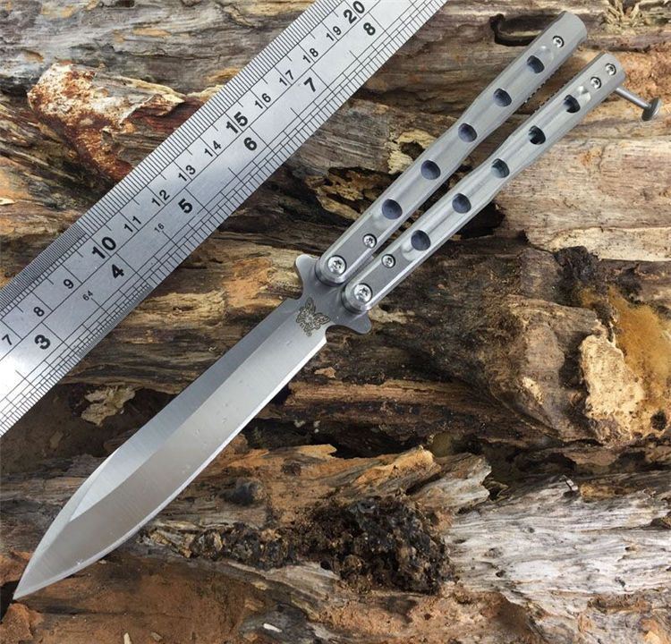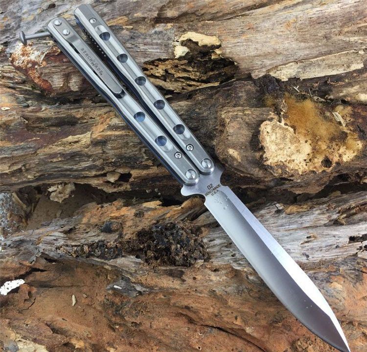 蝴蝶钛柄BM51-V6甩刀 全长:23.75CM(打开) 刃长:10.78CM 刃厚:0.254CM 刃材料:D2工具钢 刀柄:全钛柄 硬度:58 刀鞘:尼龙刀鞘 BM51钛柄甩刀,由The one (唯一)精工打造,刀柄选用一体T-4钛经数控车床(CNC)加工而成,刀刃选用优质440C刀刃,数控精磨,搭配高品质丝扣等,精工细活,为广大甩刀迷打造经典蝴蝶甩刀