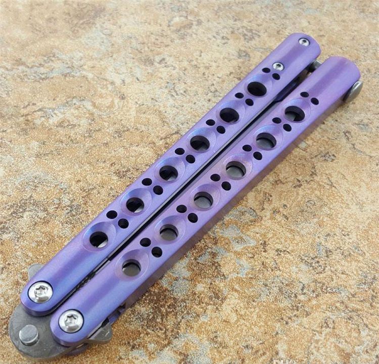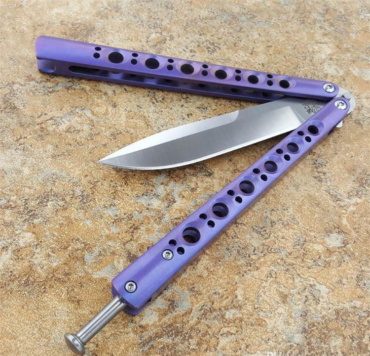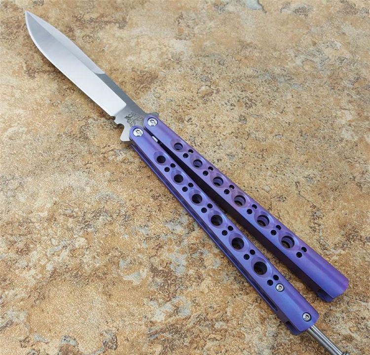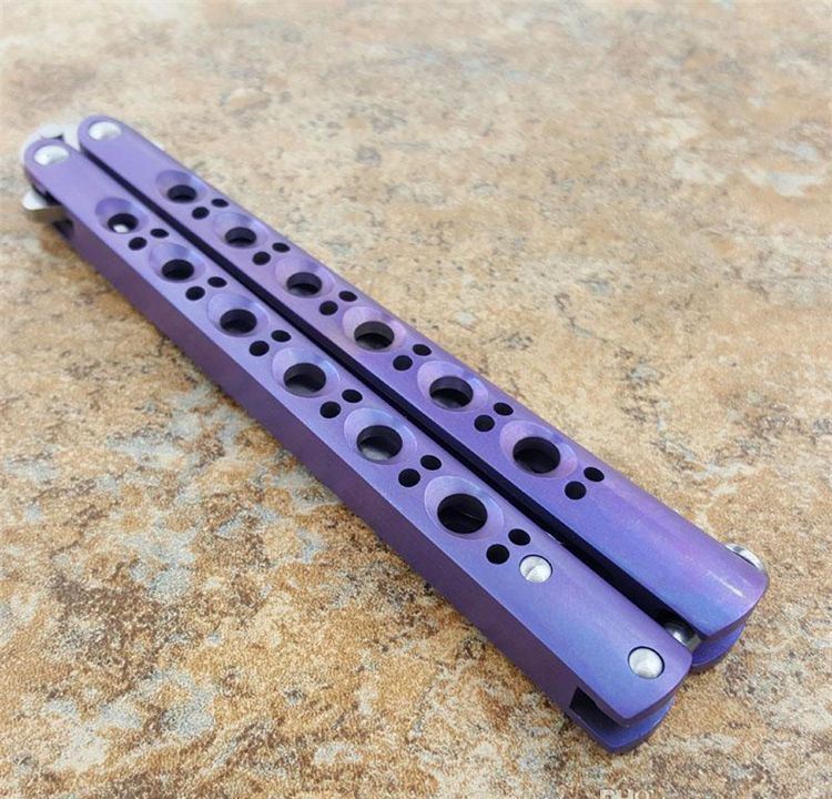 经典紫色钛柄蝴蝶甩刀BM42复刻版 全长:23.3CM(打开) 刃长:9.5CM 刃厚:0.3CM 刃材料:440C不锈钢 表面:钛柄氧化紫色 硬度:58 重量:115克 刀鞘:尼龙刀鞘 由The one (唯一)精工打造,刀柄选用一体T-4钛经数控车床(CNC)加工而成,整体重量115克,1:1复刻原版,蝴蝶标,刀刃选用优质440C刀刃,数控精磨,搭配高品质丝扣等,精工细活,为广大甩刀迷打造经典蝴蝶甩刀