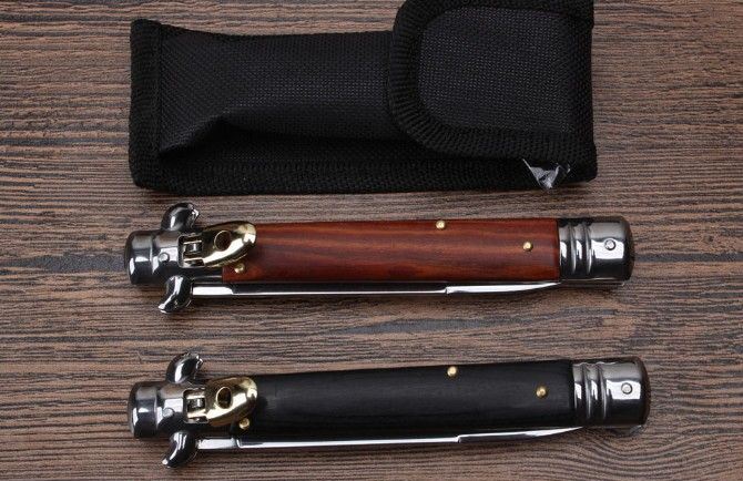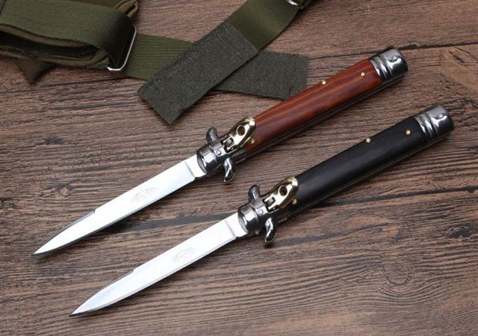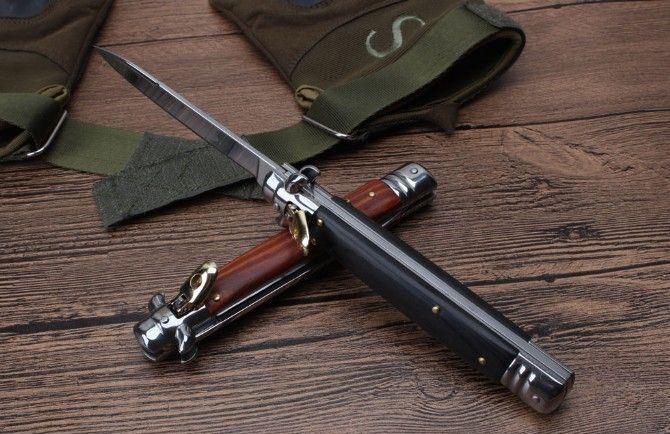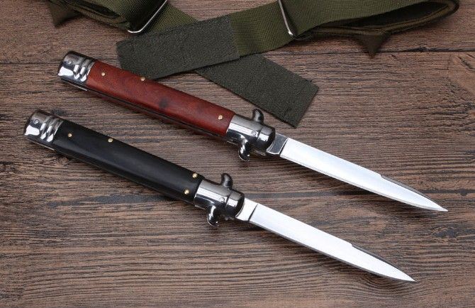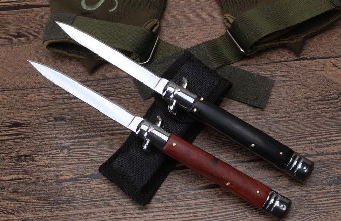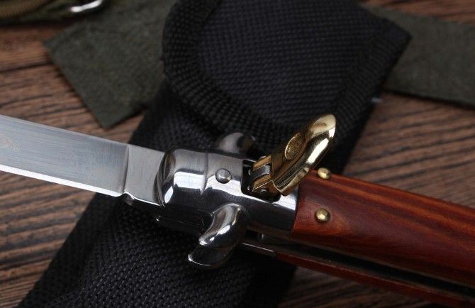 2017款11寸意大利AKC古典跳刀酸枝木柄 全长:24CM 刃长:10CM 刃厚:0.25MM 刃材料:5CR13MOV 硬度:HRC58 柄材料:双钢头+酸枝木 重量:124克(净重) 146(毛重) 附送尼龙套彩盒