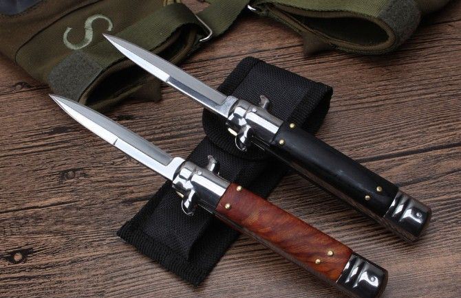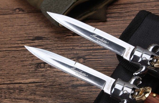 2017款9寸意大利Akc古典跳刀酸枝木柄 全长:19CM 刃长:7.8CM 刃厚:0.25MM 刃材料:5CR13MOV 表面:镜 光 硬度:HRC58 柄材料:双钢头+酸枝 重量:107克(净重) 123(毛重) 附送尼龙套彩盒