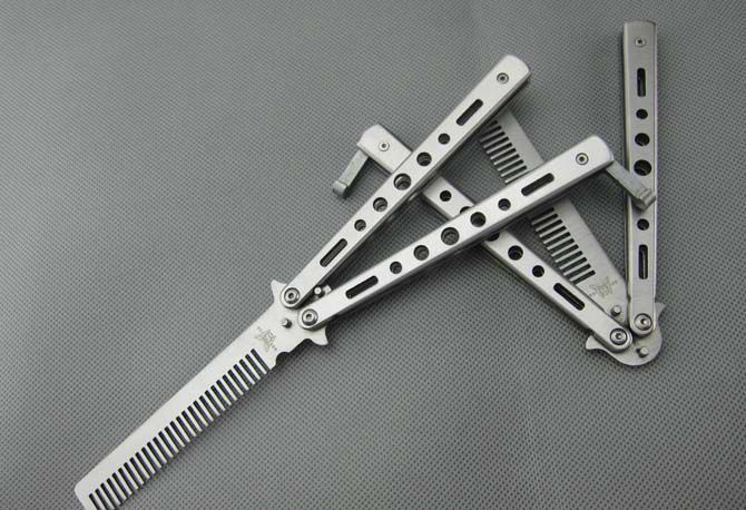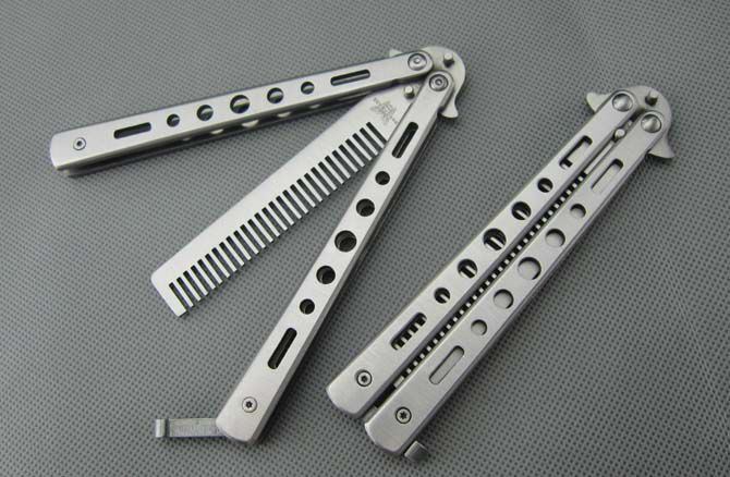 梳子蝴蝶训练刀(白版) 全 长:22.0cm 刃 长:9.0cm 柄 长:12.2cm 刃 宽:1.7cm 刃 厚:1.4mm 刃 材:420 硬 度:52 刀 柄:钢柄 表 面:砂光 重 量:100.0克