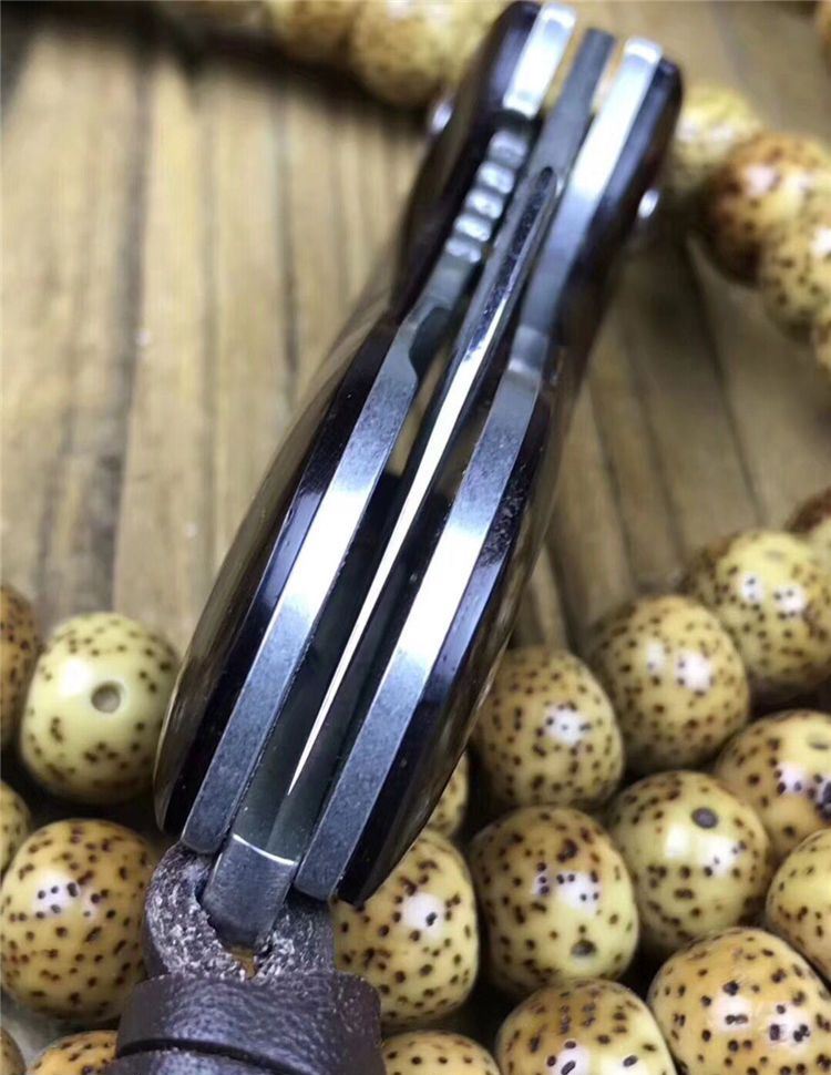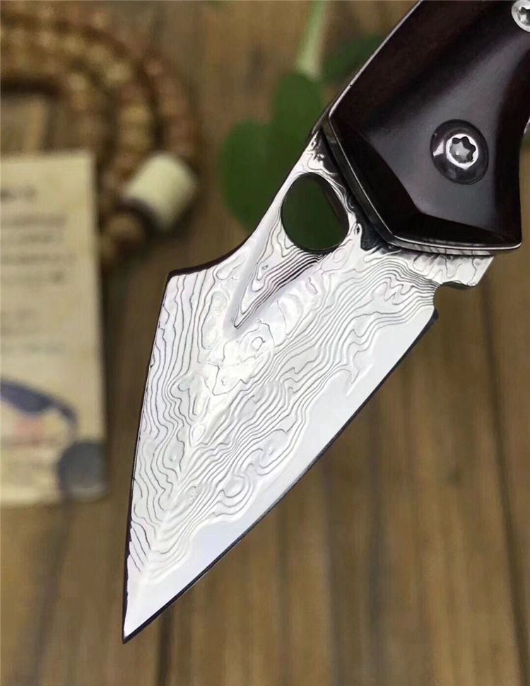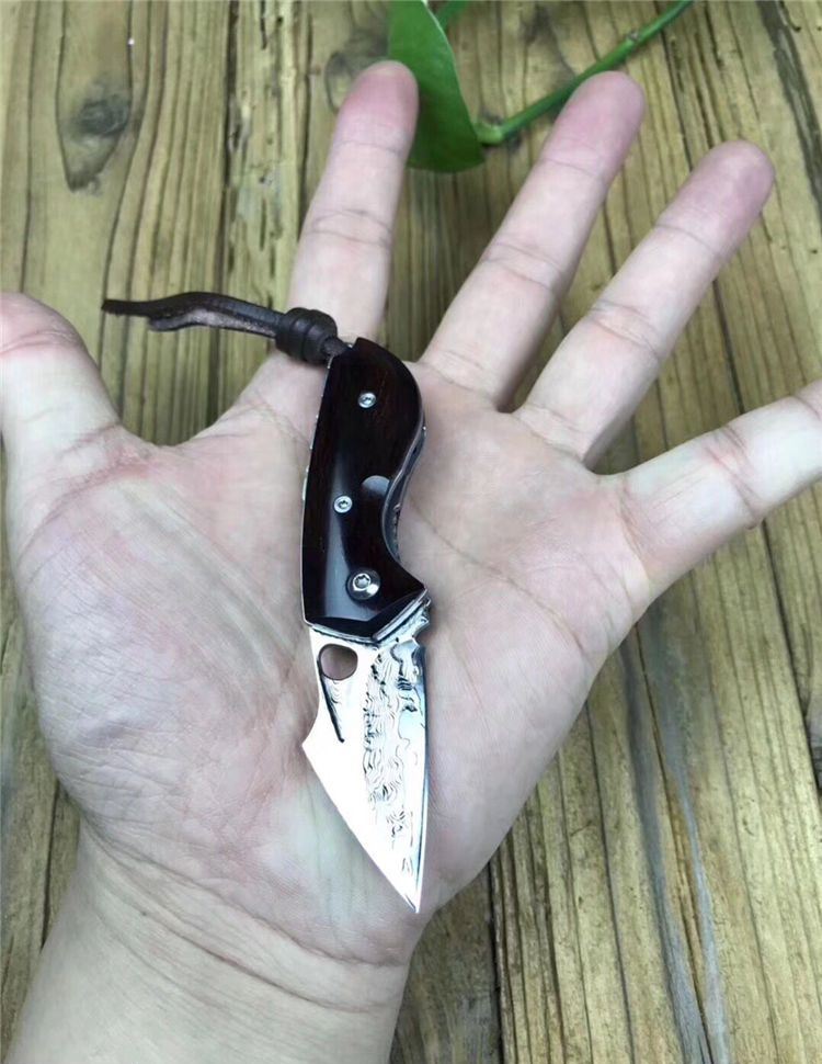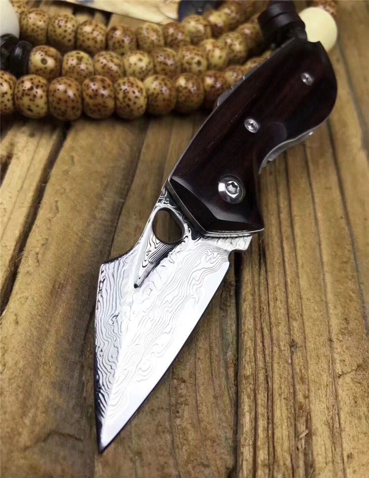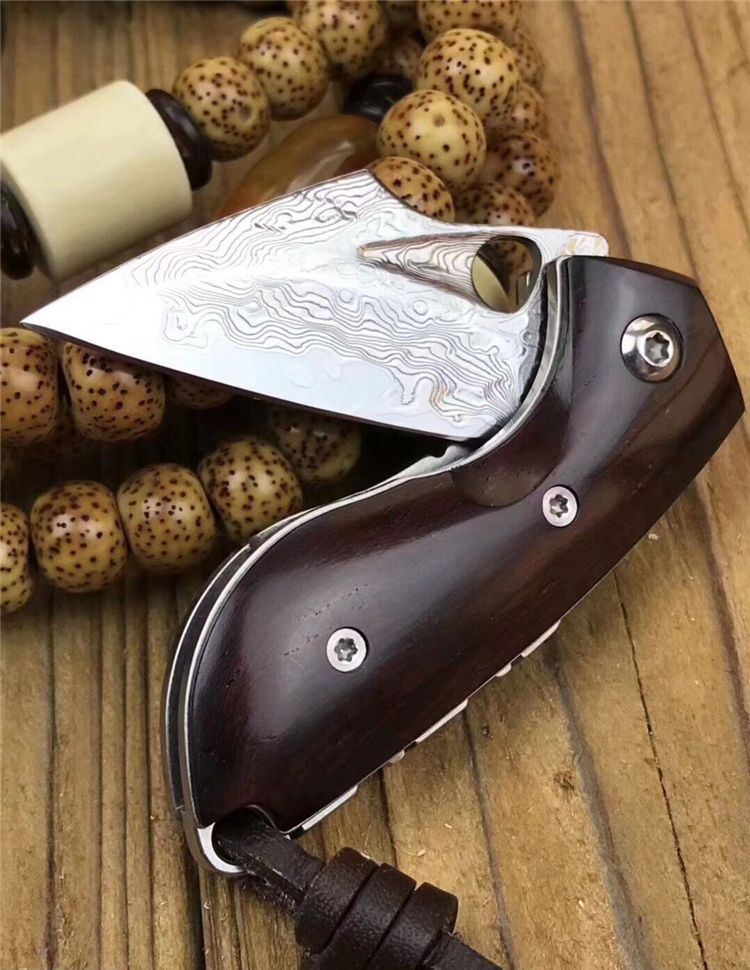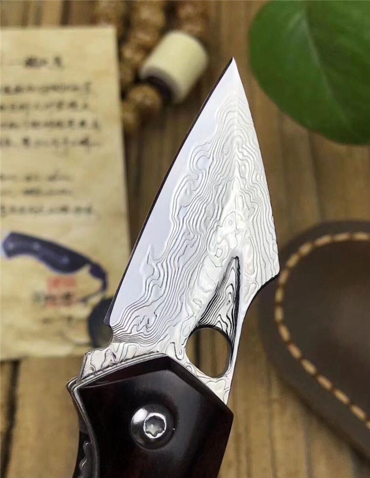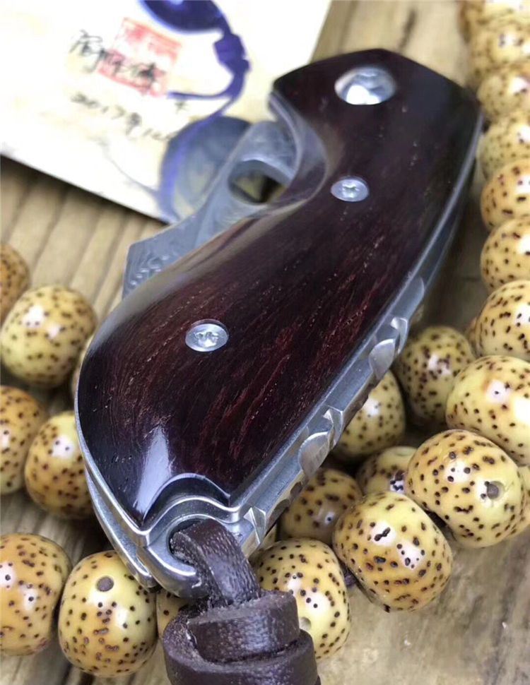 简师傅猫头鹰大马士革折刀 全长:10.8cm 刃长:4.6cm 刃厚:2mm 硬度:60HRC 刃材:VG10刃钢大马士革锻打 刀柄:大叶紫檀木柄 赠送头层牛皮手工缝制皮套,简师傅亲笔证书,复古礼盒包装