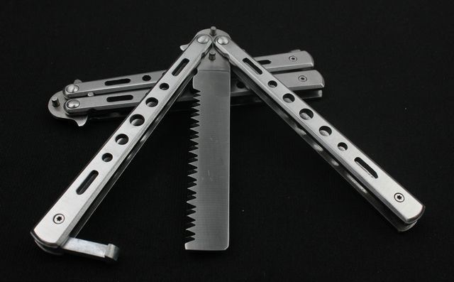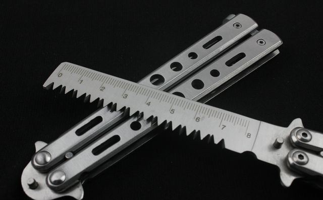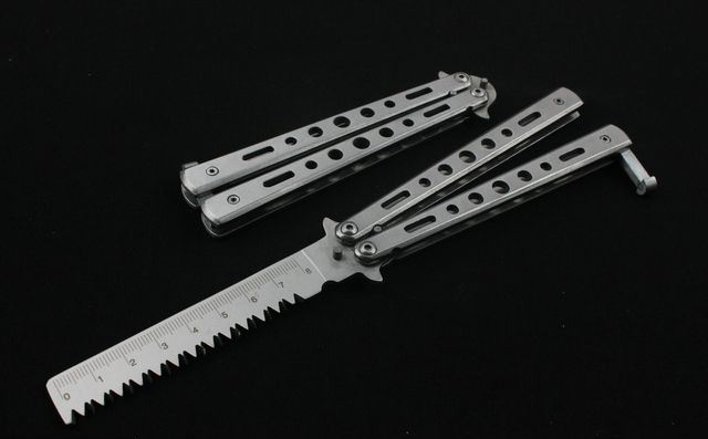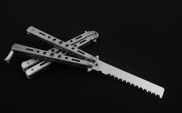 尺齿蝴蝶刀(沙光) 全 长:22.0cm 刃 长:9.0cm 柄 长:12.2cm 刃 宽:1.7cm 刃 厚:1.4mm 刃 材:420 刀 柄:钢柄 表 面:沙光 重 量:120.0克