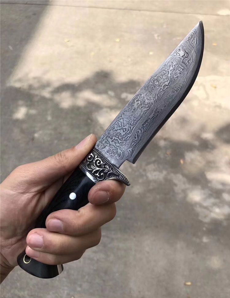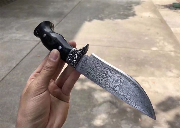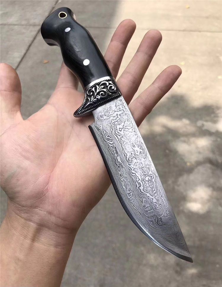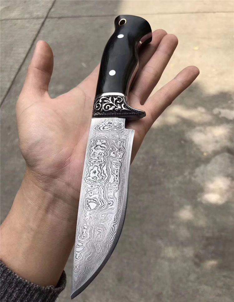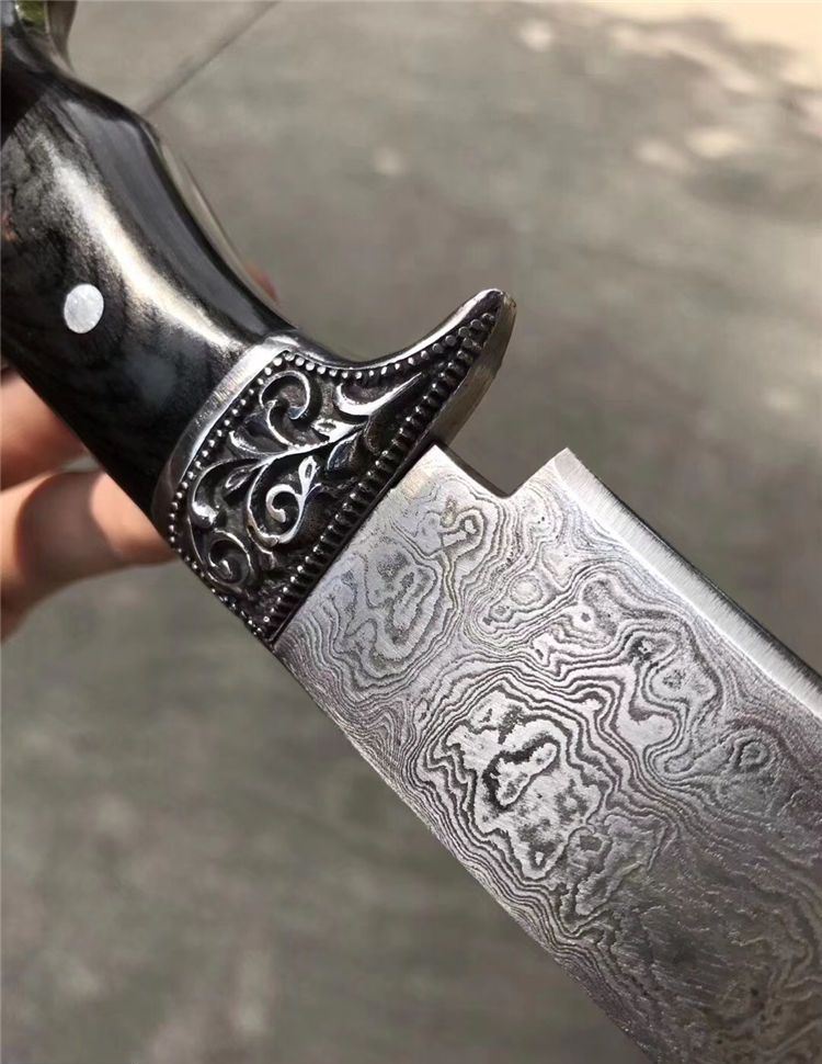 采用顶级大马士革高碳钢重本打造,锻打腾龙花纹朵朵饱满,手柄为进口黑彩木,经一级抛光。钢头护手雕花一叶知秋,尾部预留黄铜 孔可以挂心爱的饰品。一级工艺大师作品,锋利度好,是收藏送礼把玩之精品!
