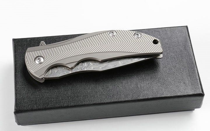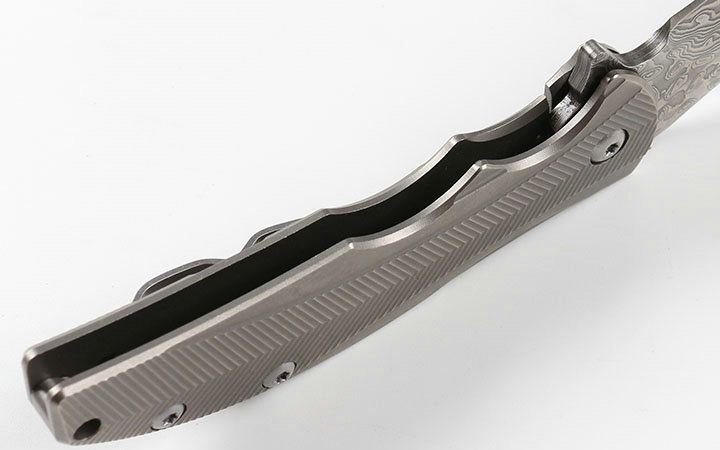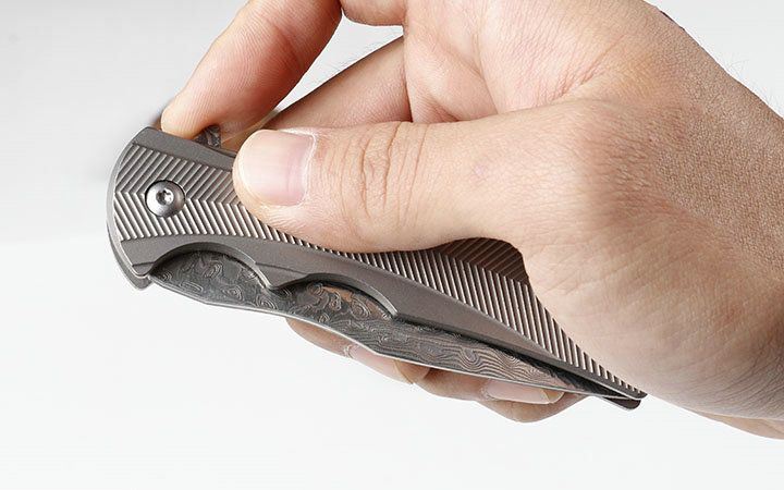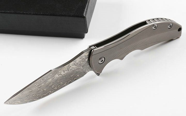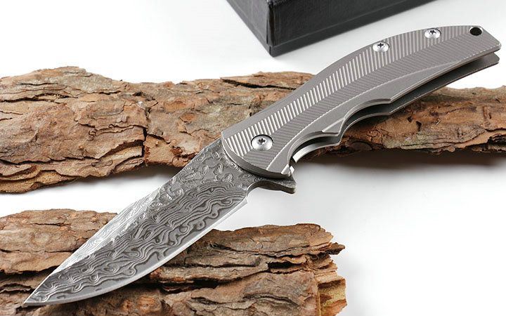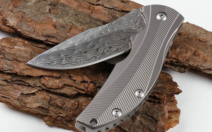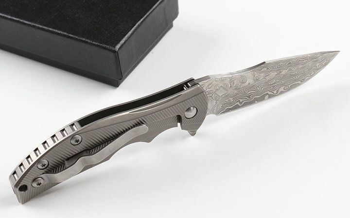 零公差ZT0606柄钛大马士革折刀 全 长:17.6cm 刃 长:7.8cm 柄 长:6.8cm 刃 宽:2.5cm 刃 厚:3.3mm 刃 材:VG10大马士革 重 量:130g(含包装) 硬 度:56-57HRC 表 面:大马士革原有纹 柄 材:CNC钛柄 锁 型:侧锁,内轴承,开刀更流畅 其 他:礼品盒+真皮套